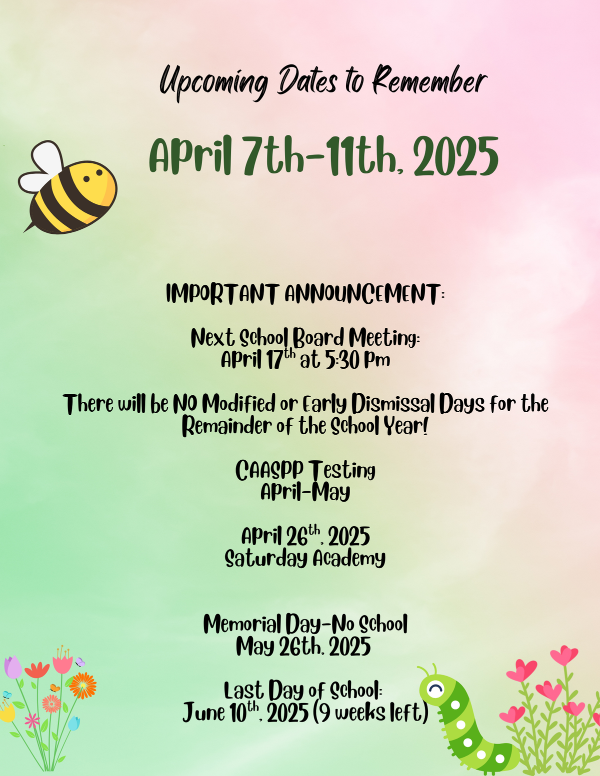 Page Two & Two B: Upcoming Dates to Remember-April 7th-11th, 2025. IMPORTANT ANNOUNCEMENT: Next School Board Meeting: April 17th at 5:30 pm There will be NO Modified or Early Dismissal Days for the Remainder of the School Year! CAASPP Testing-April-May. April 26th, 2025, Saturday Academy. Memorial Day-No School