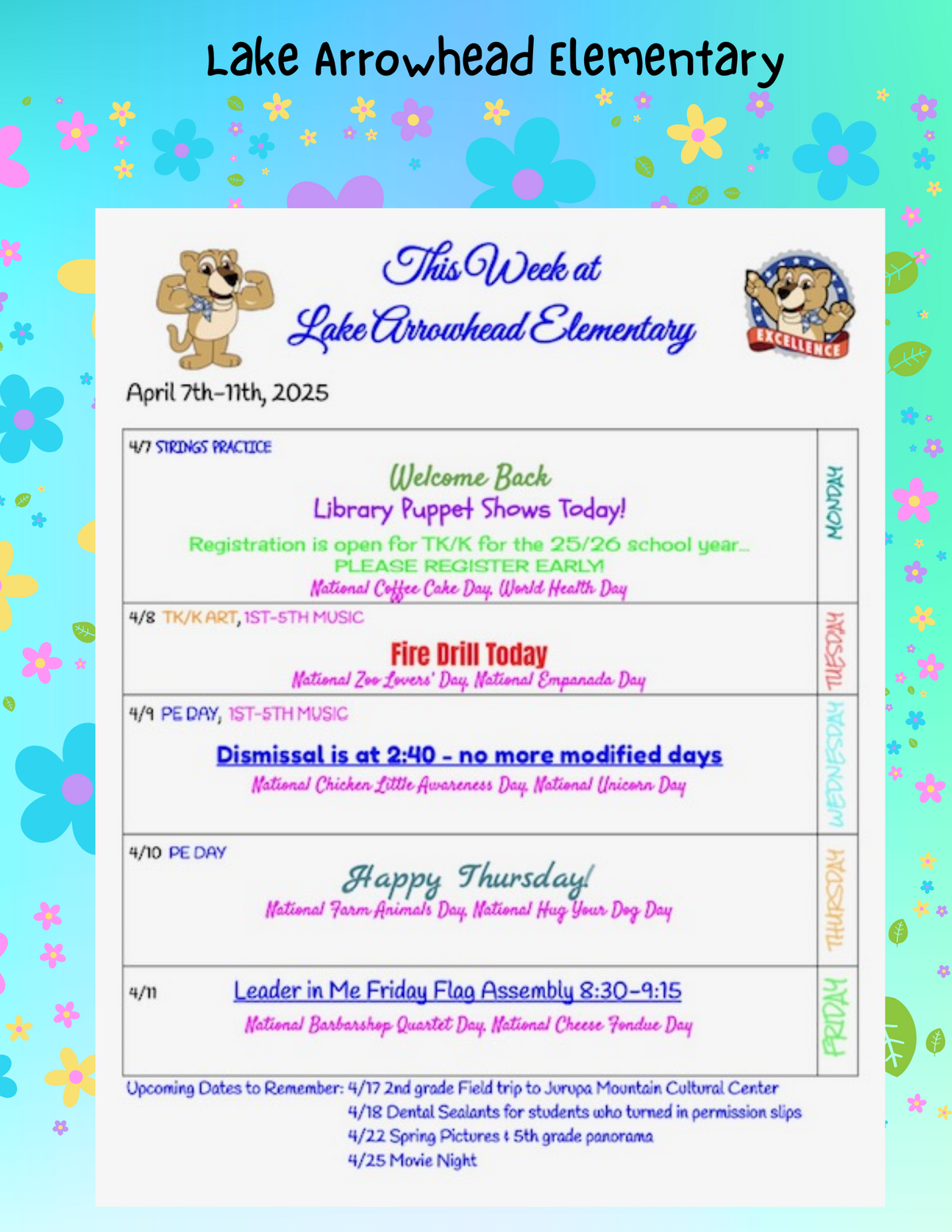 Page Ten: LAE: 4/7 Strings Practice. Welcome Back-Library Puppet Show Today!. Registrations open for TK & K for the 25/26 school year...Please Register Early. National Coffee Cake Day World Health Day.; 4/8: TK & K Art & 1st-5th Music. Fire Drill. Today is National Zoo Lover's Day, National Empanada Day.; 4/9: PE Day, 1st - 5th Grades Music. Dismissal is at 2:40pm-No More Modified Days. National Chicken Little Awareness Day & National Unicorn Day.; 4/10: PE Day. Happy Thursday. National Farm Animals Day, National Hug Your Dog Day.; 4/11: Leader in Me Friday Flag Assembly 8:30 am to 9:15 am. National Barbershop Quartet Day & National Cheese Fondue Day! Upcoming Dates to Remember: 4/17-2nd grade Field Trip to Jurupa Mountain Cultural Center. 4/18: Dental Sealants for students who turned in permission slips. 4/22: Spring Pictures & 5th grade panorama. and 4/25: Movie Night.