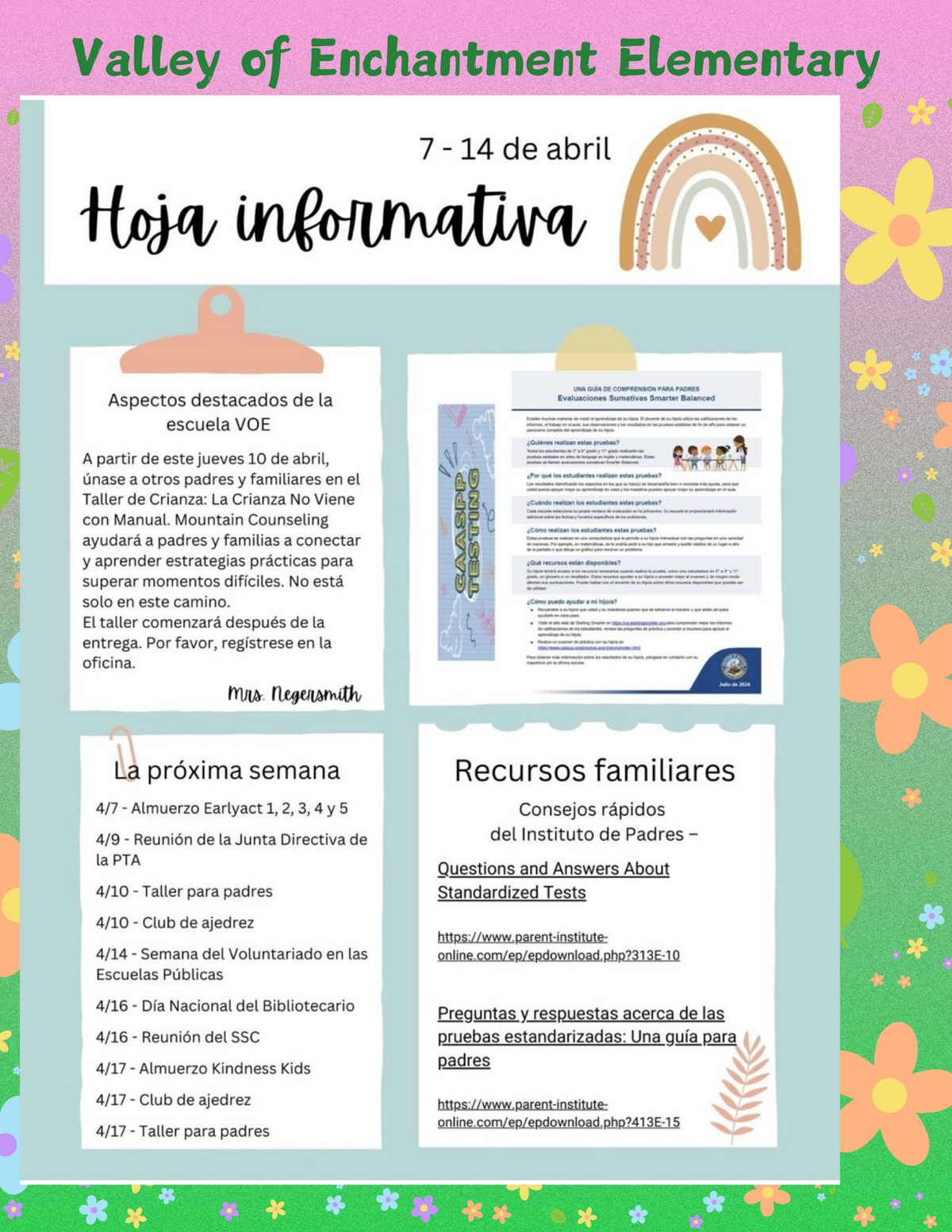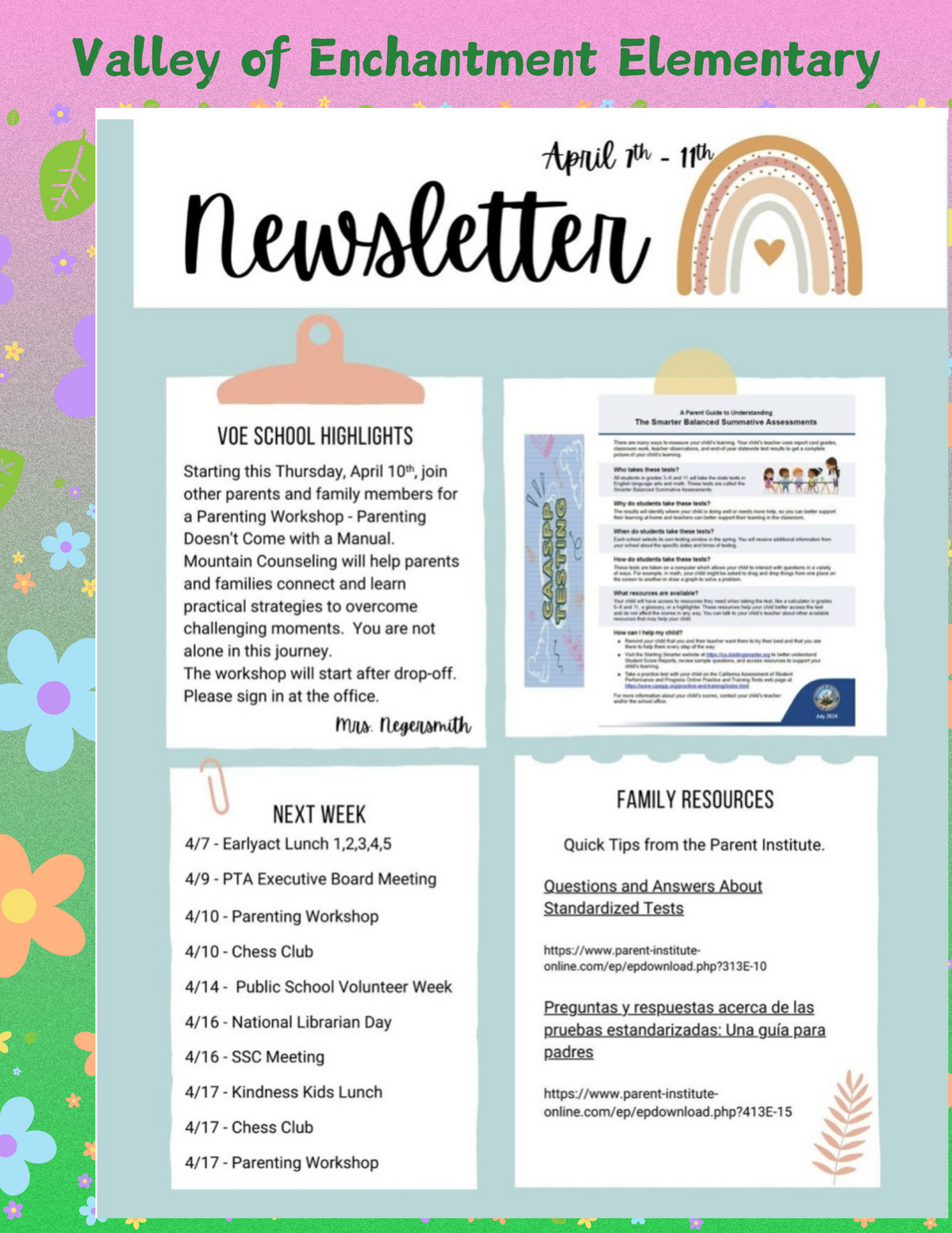 Page Five & Six: VOE: VOE School Highlights. Starting this Thursday, April 10th, join other parents & family members for a Parenting Workshop. "Parenting Doesn't Come with a Manual". Mountain Counseling will help parents and families connect & learn practical strategies to overcome challenging moments. You are not alone in this journey. Please sign in at the office. Mrs. Negersmith. Next Week: 4/7-EarlyAct Lunch 1,2,3,4,5. 4/9: PTA Executive Board Meeting. 4/10: Parenting Workshop &* Chess Club. 4/14: Public School Volunteer Week. 4/16: SSC Meeting. 4/17: Kindness Kids Lunch, Chess Club, & Parenting Workshop. Family Resources: Quick Tips from Parent Institute: Questions & Answers About Standardized Tests: https://www.parent-institute-online.com/ep/epdownload.php?313E-10