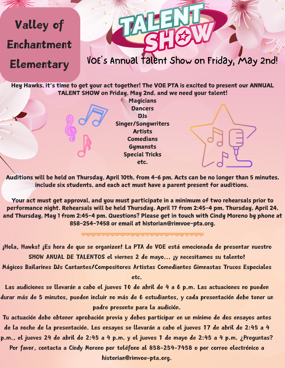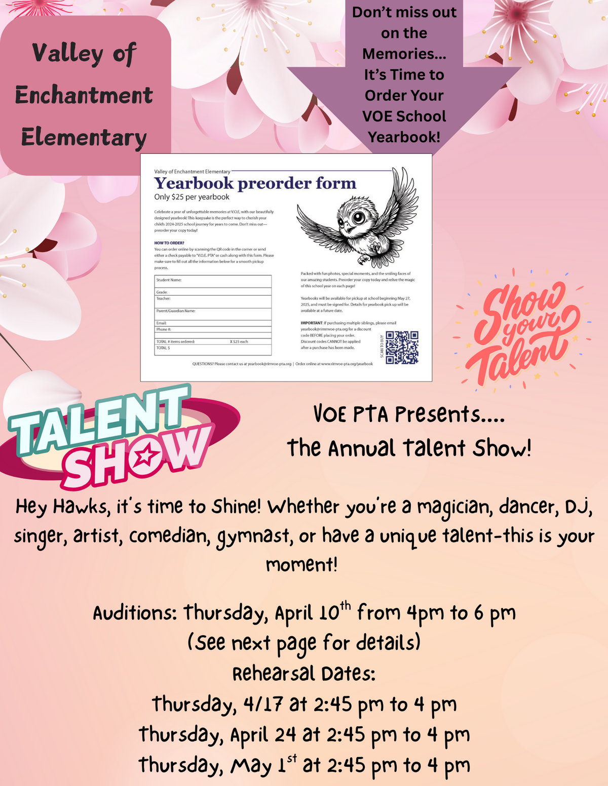 Page Eight & Nine: VOE Yearbook Pre-order Form and ordering reminder. Don't miss out on the memories...It's time to order your VOE school yearbook. VOE PTA Presents...The Annual Talent Show! Hey Hawks, it's time to shine! Whether you're a magician, dancer, DJ, singer, artist, comedian, gymnast, or have a unique talent-this is your moment. Auditions are held on Thursday, April 10th from 4pm to 6pm. (See next page for details). Rehearsal Dates: Thursday, 4/17 at 2:45 pm to 4 pm. Thursday, April 24th at 2:45 pm to 4 pm. and Thursday, May 1st at 2:45 pm to 4 pm. VOE's Annual Talent Show on Friday May 2nd, 2025. Hey Hawks, Its time to get your act together. The VOE PTA is excited to present our ANNUAL TALENT SHOW-we need your talent. Magicians, Dancers, DJs, Singer/Songwriters, Artists, Comedians, Gymnasts, Special Tricks, etc. Auditions will be held on Thursday, April 10th from 4-6 pm. Acts can be NO longer that 5 minutes, include six students, and each act must have a parent present for auditions. Your act must get approval, and you must participate in a minimum of two rehearsals prior to performance night. Rehearsals will be held Thursday, 4/17 from 2:45pm to 4pm, 4/24 and May 1st from 2:45 pm to 4 pm. If you have questions, please get in touch with Cindy Moreno by phone at (858) 254-7458 or email at historian@rimvoe-pta.org
