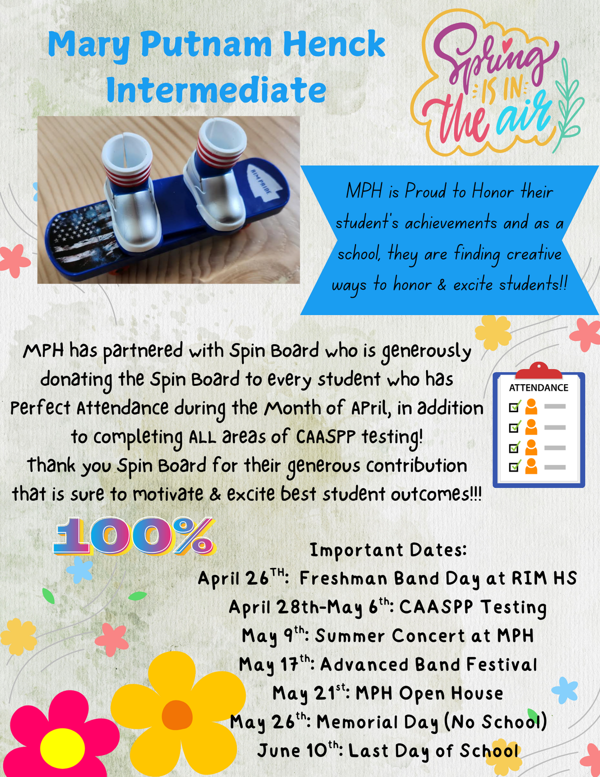 Page Eleven: MPH: MPH is Proud to Honor their student's achievements and as a school, they are finding creative ways to honor & excite students! MPH has partnered with Spin Board who is generously donating the Spin Board to every student who has perfect attendance during the Month of April, in addition to completing all areas of CAASPP testing! Thank you Spin Board for their generous contribution that is sure to motivate & excite best student outcomes. Important Dates: April 26TH: Freshman Band Day at RIM HS April 28th-May 6th: CAASPP Testing May 9th: Summer Concert at MPH May 17th: Advanced Band Festival May 21st: MPH Open House