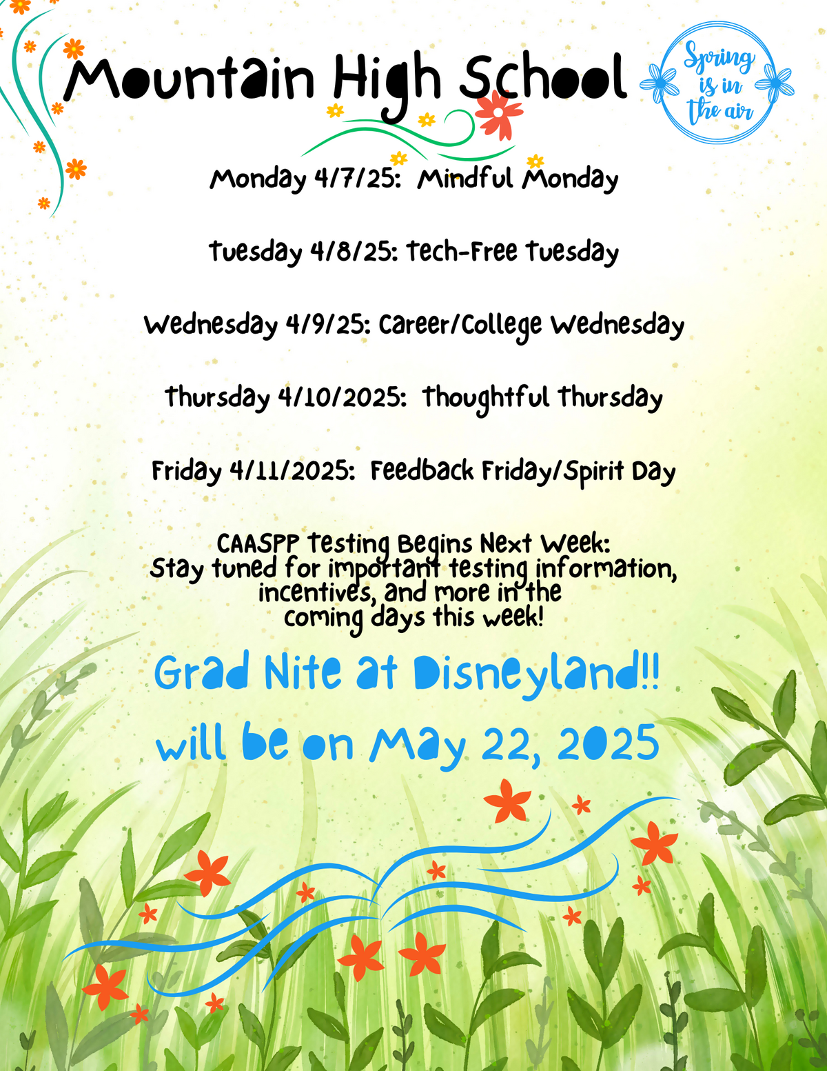 Page Thirteen: Mountain High School-Monday 4/7/25: Mindful Monday ; Tuesday 4/8/25: Tech-Free Tuesday; Wednesday 4/9/25: Career/College Wednesday; Thursday 4/10/2025: Thoughtful Thursday; Friday 4/11/2025: Feedback Friday/Spirit Day CAASPP Testing Begins Next Week: Stay tuned for important testing information, incentives, and more in the coming days this week!