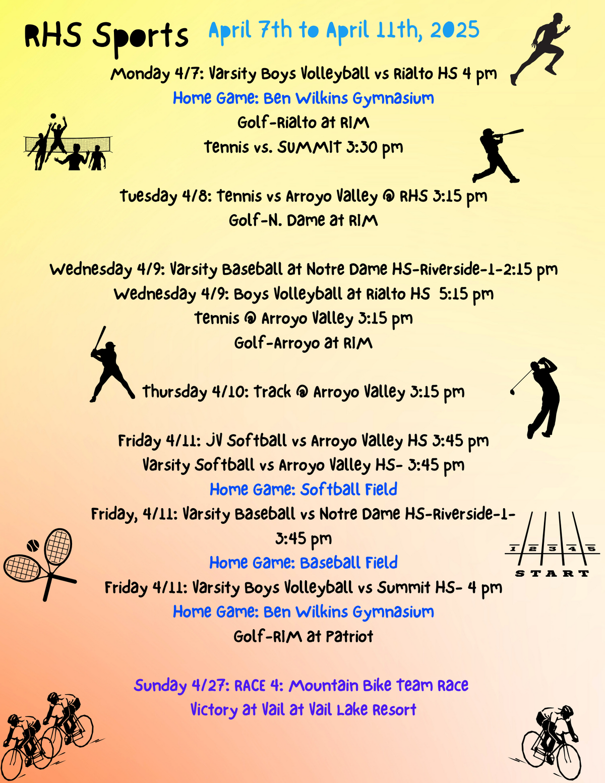 Tuesday 4/8: Tennis vs Arroyo Valley @ RHS 3:15 pm Golf-N. Dame at RIM Wednesday 4/9: Varsity Baseball at Notre Dame HS-Riverside-1-2:15 pm Wednesday 4/9: Boys Volleyball at Rialto HS 5:15 pm Tennis @ Arroyo Valley 3:15 pm Golf-Arroyo at RIM Thursday 4/10: Track @ Arroyo Valley 3:15 pm Friday 4/11: JV Softball vs Arroyo Valley HS 3:45 pm Varsity Softball vs Arroyo Valley HS- 3:45 pm Home Game: Softball Field Friday, 4/11: Varsity Baseball vs Notre Dame HS-Riverside-1-3:45 pm Home Game: Baseball Field Friday 4/11: Varsity Boys Volleyball vs Summit HS- 4 pm Home Game: Ben Wilkins Gymnasium Golf-RIM at Patriot Sunday 4/27: RACE 4: Mountain Bike Team Race Victory at Vail at Vail Lake Resort.