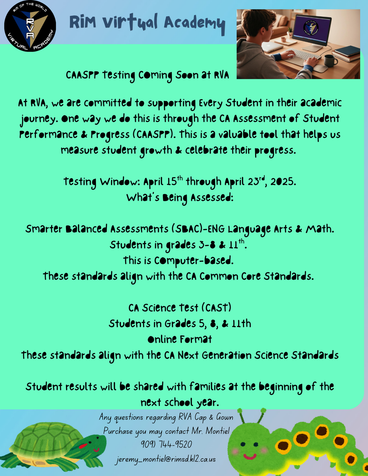 Students in grades 3-8 & 11th. This is Computer-based. These standards align with the CA Common Core Standards. CA Science Test (CAST) Students in Grades 5, 8, & 11th Online Format These standards align with the CA Next Generation Science Standards Student results will be shared with families at the beginning of the next school year. Any questions regarding RVA Cap & Gown Purchase you may contact Mr. Montiel