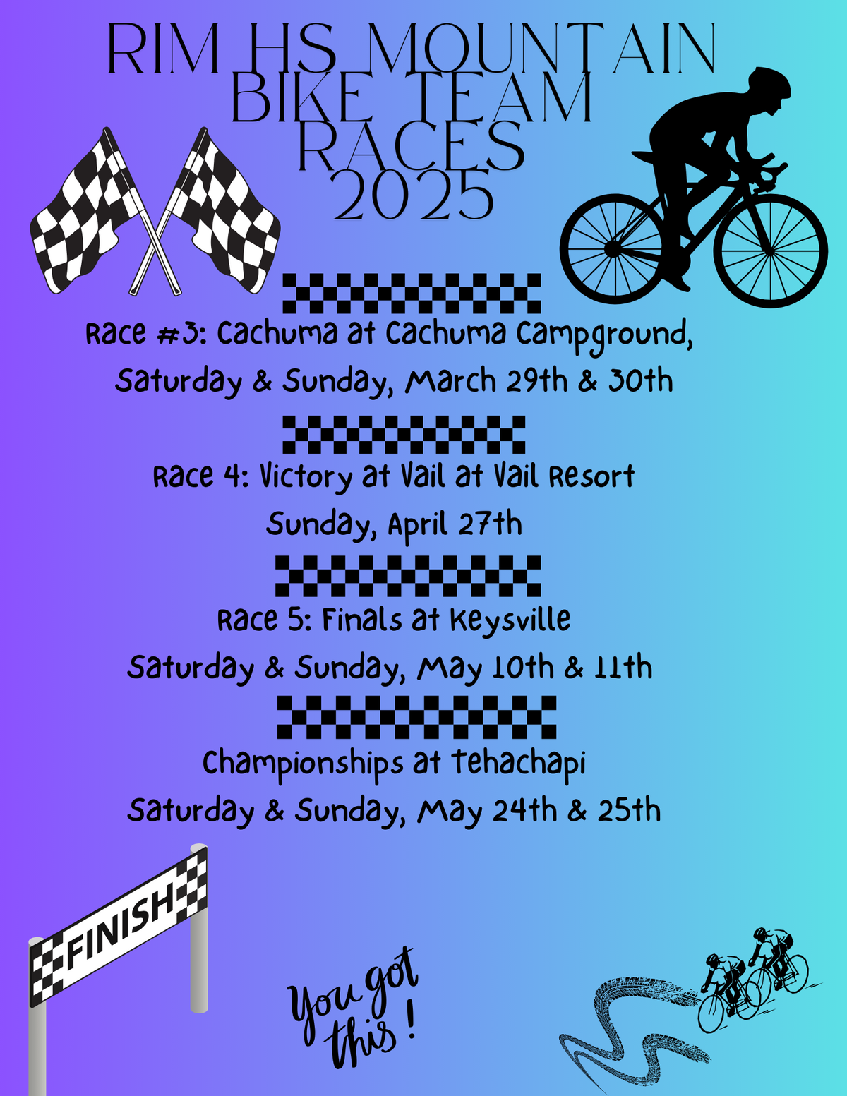 Page Twenty Two: RIM HS Mountain Bike Team Races 2025. Race #4: Victory at Vail at Vail Resort. Sunday April 27th. Race #5 are the Finals at Keysville on Saturday & Sunday May 10th & 11th. and Championships at Tehachapi on Saturday & Sunday May 24th & 25th.