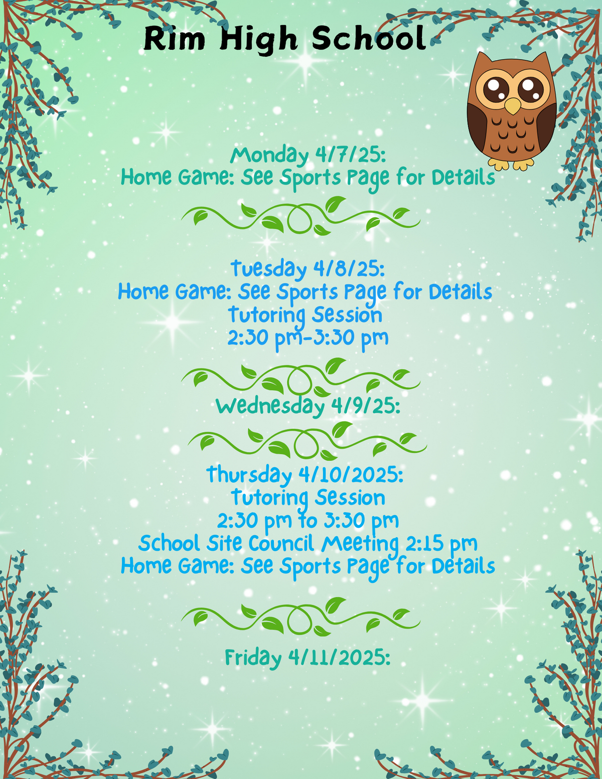 Page Fifteen: RHS: Monday 4/7/25: Home Game: See Sports Page for Details Tuesday 4/8/25: Home Game: See Sports Page for Details Tutoring Session 2:30 pm-3:30 pm Wednesday 4/9/25: Thursday 4/10/2025: Tutoring Session 2:30 pm to 3:30 pm School Site Council Meeting 2:15 pm Home Game: See Sports Page for Details Friday 4/11/2025.