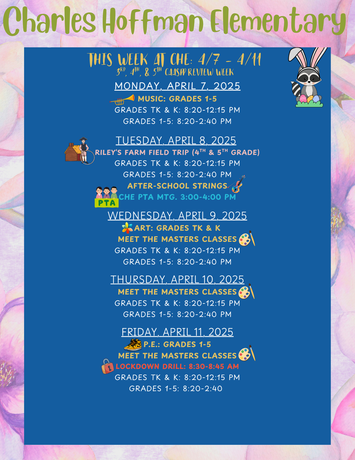 Page Three: CHE: Monday, 4/7: Music Grades 1-5. School Hours: Grades TK & K: 8:20 am to 12:15 pm. Grades 1-5 School Hours 8:20 am to 2:40 pm. Tuesday, 4/8: Riley's Farm Field Trip for 4th & 5th Graders. After School Strings and CHE PTA Meeting from 3 to 4 pm. School Hours: Grades TK & K: 8:20 am to 12:15 pm. Grades 1-5 School Hours 8:20 am to 2:40 pm. Wednesday, 4/9: Art Grades TK & K. Meet the Masters Classes. School Hours: Grades TK & K: 8:20 am to 12:15 pm. Grades 1-5 School Hours 8:20 am to 2:40 pm. Thursday, 4/10: Meet the Masters Classes. School Hours: Grades TK & K: 8:20 am to 12:15 pm. Grades 1-5 School Hours 8:20 am to 2:40 pm. Friday, 4/11: PE Grades 1-5. Meet the Masters Classes. Lockdown Drill: 8:30 am to 8:45 am.School Hours: Grades TK & K: 8:20 am to 12:15 pm. Grades 1-5 School Hours 8:20 am to 2:40 pm.