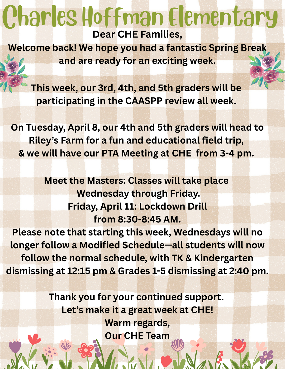 Friday, April 11: Lockdown Drill from 8:30-8:45 AM. Please note that starting this week, Wednesdays will no longer follow a Modified Schedule—all students will now follow the normal schedule, with TK & Kindergarten dismissing at 12:15 pm & Grades 1-5 dismissing at 2:40 pm. Thank you for your continued support. Let’s make it a great week at CHE! Warm regards, Our CHE Team.