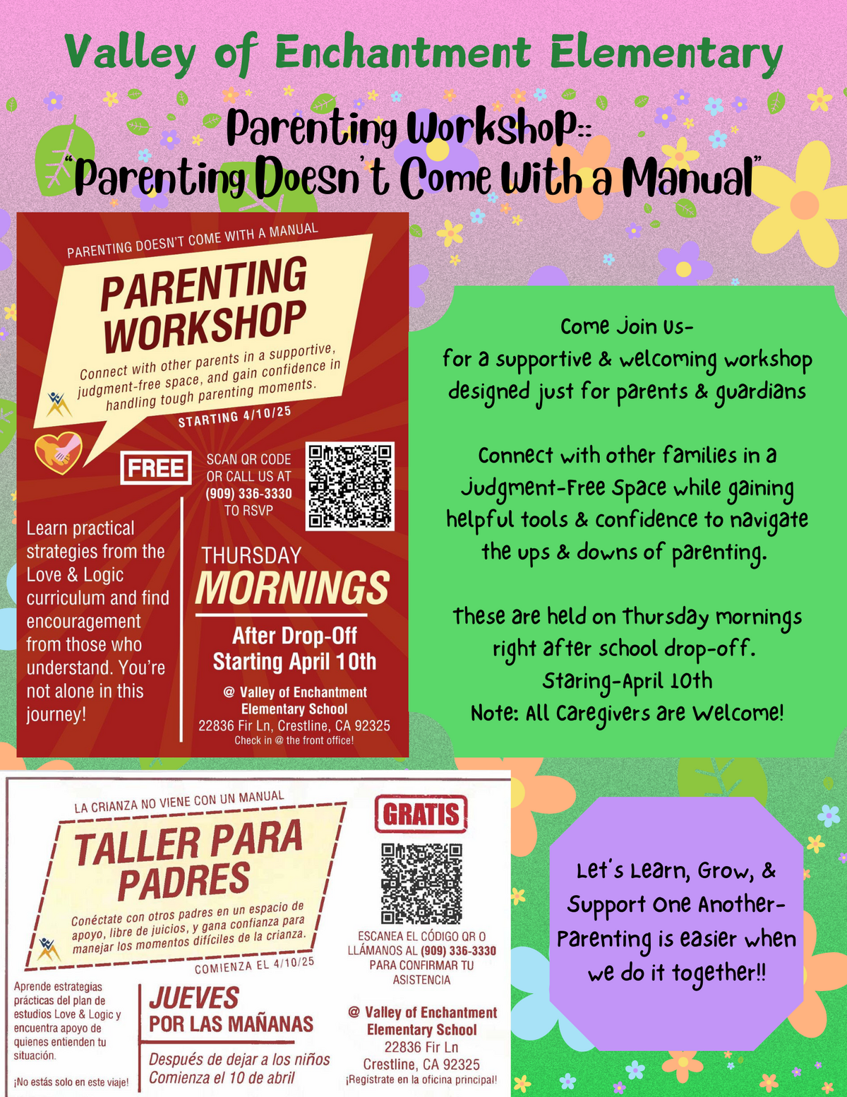 Page Seven: VOE Parenting Workshop: "Parenting Doesn't Come with a Manual". Connect with other parents in a supportive, judgment-free space, and gain confidence in handling tough parenting moments. Starting 4/10/2025. The classes are Free. Come learn practical strategies from the Love & Logic curriculum & find encouragement from those who understand. You are not alone in this journey. Thursday Mornings: After Drop-off Starting April 10th. Come join us-for a supportive and welcoming workshop designed for parents & guardians. Connect with other families in a judgment-free space while gaining helpful tools & confidence to navigate the ups & downs of parenting. These are held on Thursday mornings right after school drop-off. All caregivers are welcome. Let's learn, grow, & support one another-parenting is easier when we do it together.