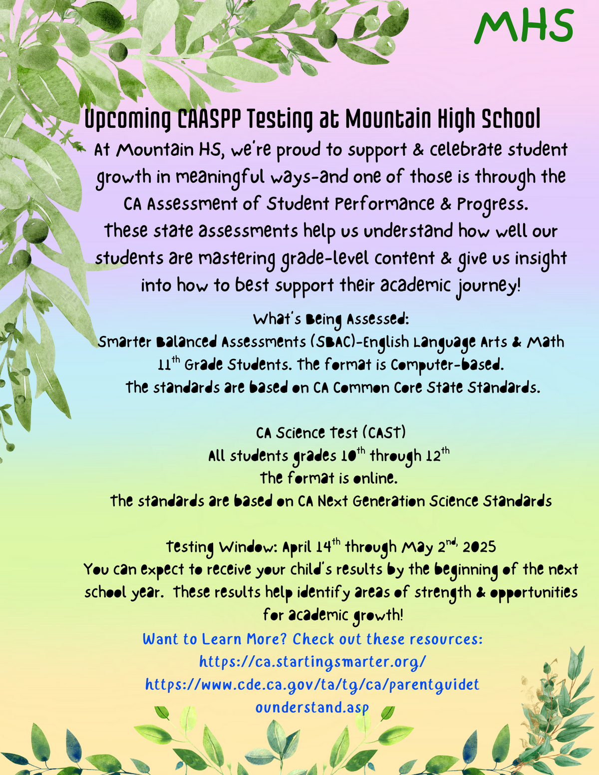 Page Fourteen: MHS:Upcoming CAASPP Testing at Mountain High School / At Mountain HS, we’re proud to support & celebrate student growth in meaningful ways-and one of those is through the CA Assessment of Student Performance & Progress. These state assessments help us understand how well our students are mastering grade-level content & give us insight into how to best support their academic journey! What’s Being Assessed: Smarter Balanced Assessments (SBAC)-English Language Arts & Math 11th Grade Students. The format is Computer-based. The standards are based on CA Common Core State Standards. CA Science Test (CAST)
