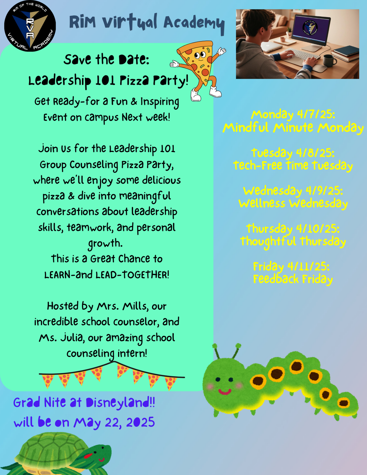 Page Twenty RVA. Save the Date: Leadership 101 Pizza Party! Get Ready-for a Fun & Inspiring Event on campus Next week! Join Us for the Leadership 101 Group Counseling Pizza Party, where we’ll enjoy some delicious pizza & dive into meaningful conversations about leadership skills, teamwork, and personal growth. This is a Great Chance to LEARN-and LEAD-TOGETHER! Hosted by Mrs. Mills,mour incredible school counselor, and Ms. Julia, our amazing school counseling intern! Monday 4/7/25: Mindful Minute Monday Tuesday 4/8/25: Tech-Free Time Tuesday Wednesday 4/9/25: Wellness Wednesday Thursday 4/10/25: Thoughtful Thursday Friday 4/11/25: Feedback Friday. Grad Nite at Disneyland!! will be on May 22, 2025
