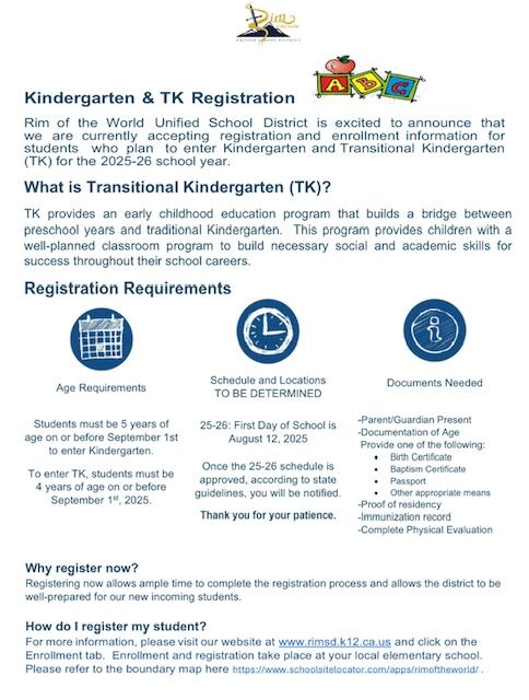 Kindergarten & TK Registration. ROWUSD is excited to announce that we are currently accepting registration and enrollment information for students who plan to enter Kindergarten and Transitional Kindergarten (TK) for the 2025-2026 school year. What is Transitional Kindergarten (TK)? TK provides an early childhood education program that builds a bridge between preschool years and traditional kindergarten. This program provides children with a well-planned classroom program to build necessary social and academic skills for success throughout their school careers. Registration Requirements: Age: Students must be 5 years of age on or before September 1st to enter Kindergarten. To enter TK, students must be 4 years of age on or before September 1st. Schedule & Locations TBD: 25-26 First Day of School is August 12th, 2025. Once the 25-26 schedule is approved, according to state guidelines, you will be notified. Thank you for Your Patience. Documents Needed: 1) Parent/Guardian Present, 2) Documentation of age: Provide one of the following: Birth Certificate, Baptism Certificate, Passport, or Other Appropriate Means. 3) Proof of residency, 5)Immunization Record, and 6) Complete Physical Evaluation. WHY Register Now? Registering now allows ample time to complete the registration process & allows the district to be well-prepared for our new incoming students. HOW do I register my student? For more information, please visit our website at www.rimsd.k12.ca.us and click on the Enrollment tab. Enrollment and registration take place at your local elementary school. Please refer to the boundary map here: https://www.schoolsitelocator.com/apps/rimoftheworld