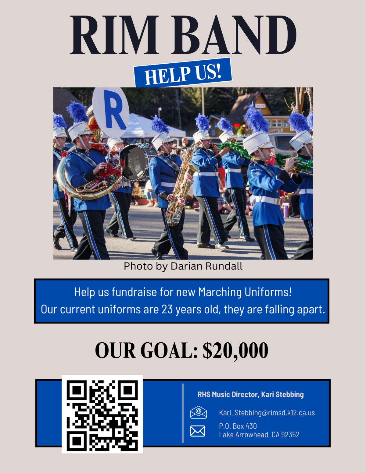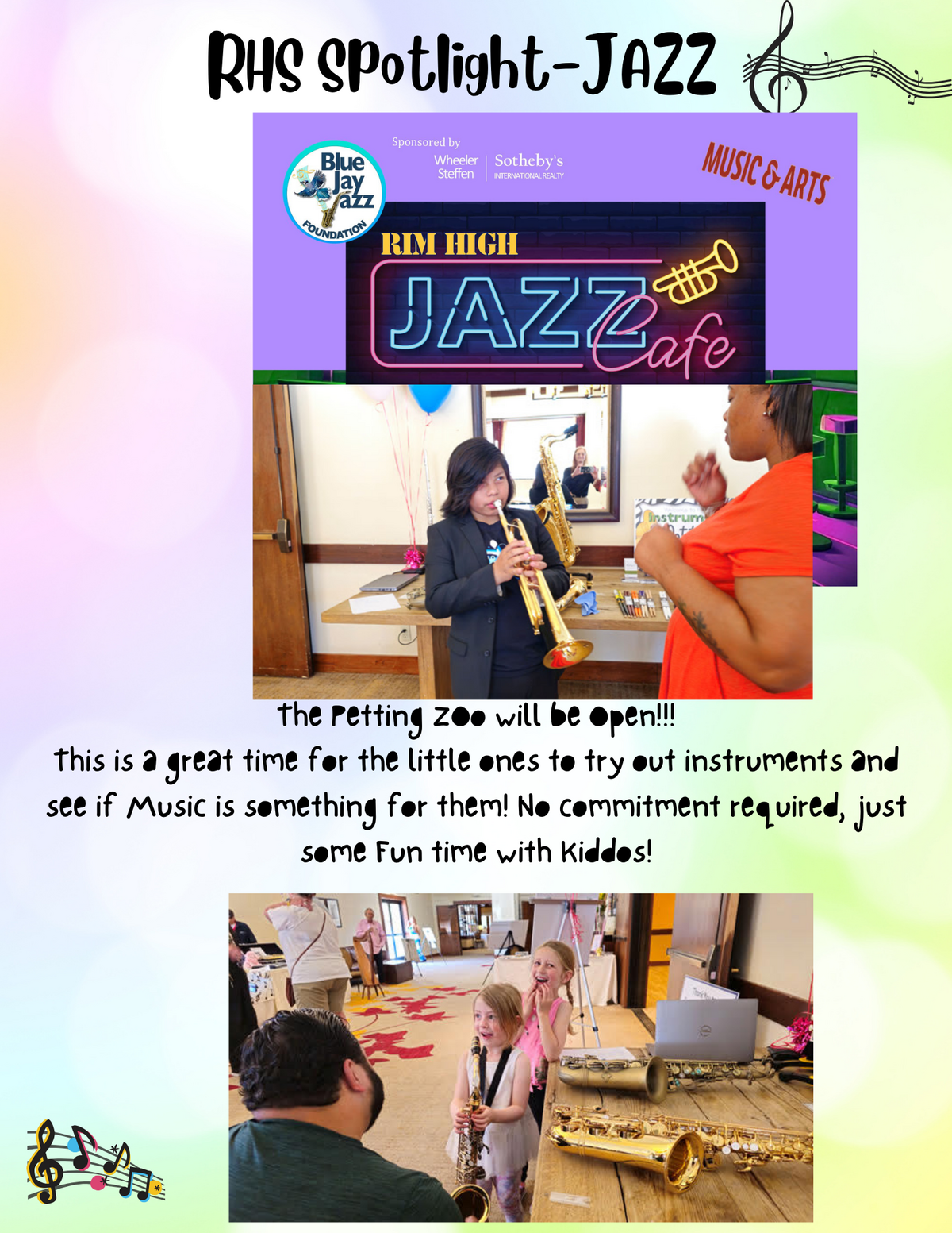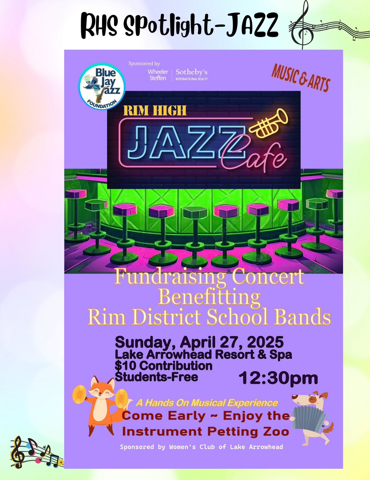 Page Seventeen-Nineteen: RHS Spotlight-JAZZ. Fundraising COncert benefitting RIM District Schools Bands. SUnday 3/27/25 at Lake Arrowhead Spa & Resort. $10 contribution and Students are free. Starting at 12:30 pm. COme early to enjoy the instrument petting zoo. The Petting ZOo will be Open!!!This is a great time for the little ones to try out instruments and see if Music is something for them! No commitment required, just some Fun time with Kiddos!