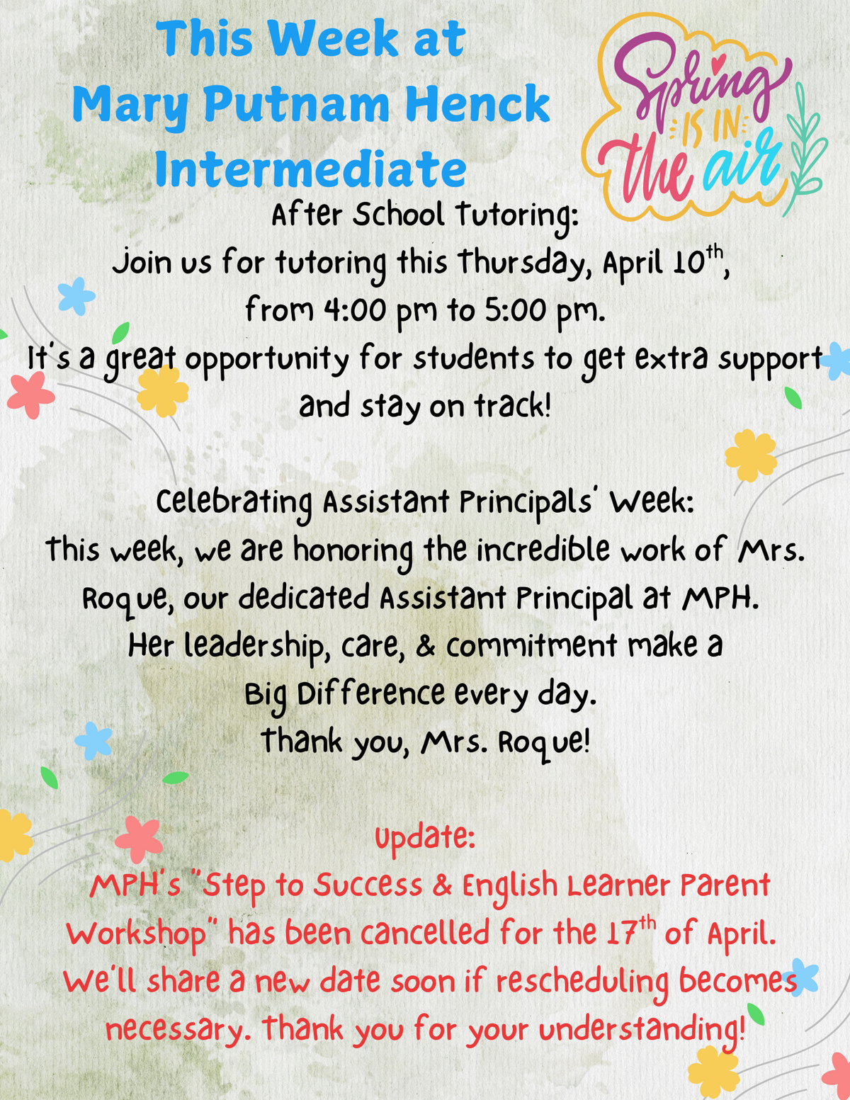 Page Twelve: This Week at Mary Putnam Henck Intermediate. After School Tutoring: Join us for tutoring this Thursday, April 10th, from 4:00 pm to 5:00 pm. It’s a great opportunity for students to get extra support and stay on track! Celebrating Assistant Principals’ Week: This week, we are honoring the incredible work of Mrs. Roque, our dedicated Assistant Principal at MPH. Her leadership, care, & commitment make a Big Difference every day. Thank you, Mrs. Roque! Upcoming Event: Step to Success & EL Parenting Workshop Mark your calendars! On Wednesday, April 17th, MPH will host the Step to Success & English Learner Parent Workshop from 5-6 pm in the Cafe. We look forward to seeing you there!