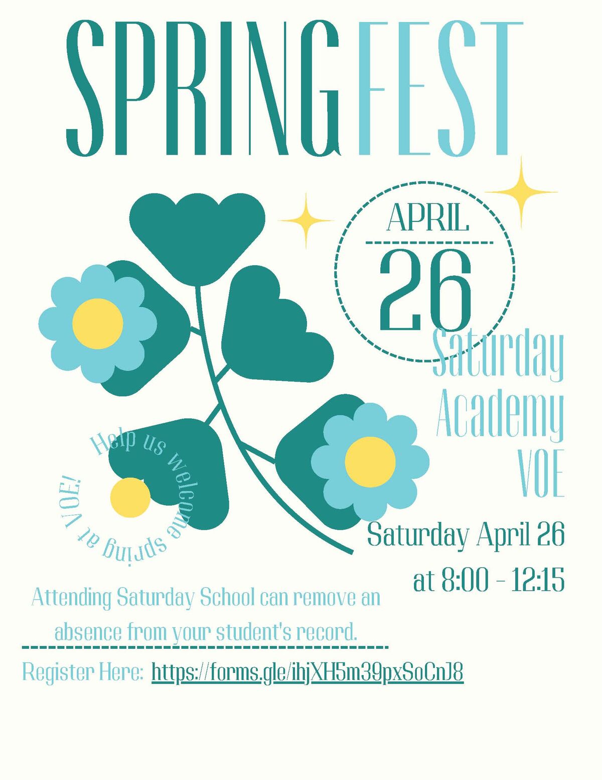 Page: VOE Springfest Saturday Academy at VOE. April 26th at 8 am to 12:15 pm. Attending Saturday Academy can remove an absence from your student's record. Register Here: https://forms.gle/fzw9FcZAauQf3Gmd8. Be sure to register by April 23rd, 2025!