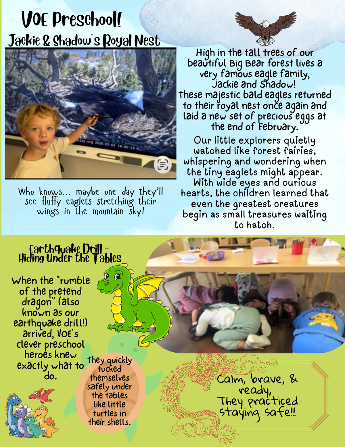 Earthquake Drill – Hiding Under the Tables. When the “rumble of the pretend dragon” (also known as our earthquake drill!) arrived, VOE’s clever preschool heroes knew exactly what to do. They quickly tucked themselves safely under the tables like little turtles in their shells. Calm, brave, & ready, they practiced staying safe!!!