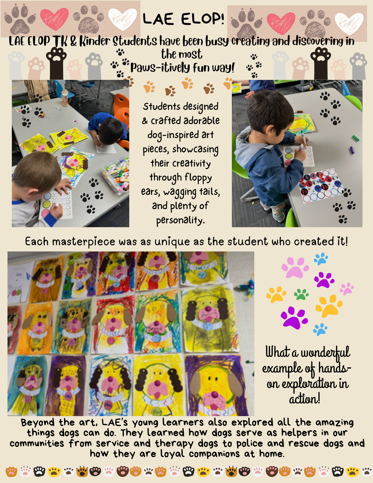 Page: LAE ELOP! LAE ELOP TK & Kinder Students have been busy creating and discovering in the most paws-itively fun way! Students designed & crafted adorable dog-inspired art pieces, showcasing their creativity through floppy ears, wagging tails, and plenty of personality. Each masterpiece was as unique as the student who created it! What a wonderful example of hands-on exploration in action! Beyond the art, LAE’s young learners also explored all the amazing things dogs can do. They learned how dogs serve as helpers in our communities, from service and therapy dogs to police and rescue dogs, and how they are loyal companions at home.