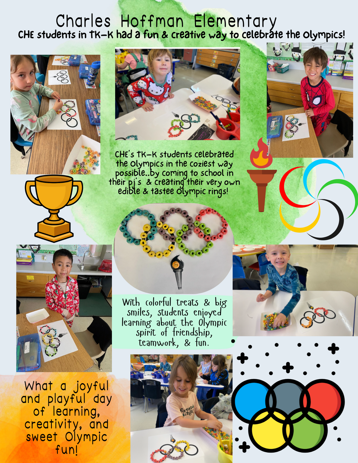 Page: Charles Hoffman Elementary-CHE students in TK–K had a fun & creative way to celebrate the Olympics! CHE’s TK–K students celebrated the Olympics in the coziest way possible..by coming to school in their pj’s & creating their very own edible & tastee Olympic rings! With colorful treats & big smiles, students enjoyed learning about the Olympic spirit of friendship, teamwork, & fun. What a joyful and playful day of learning, creativity, and sweet Olympic fun!