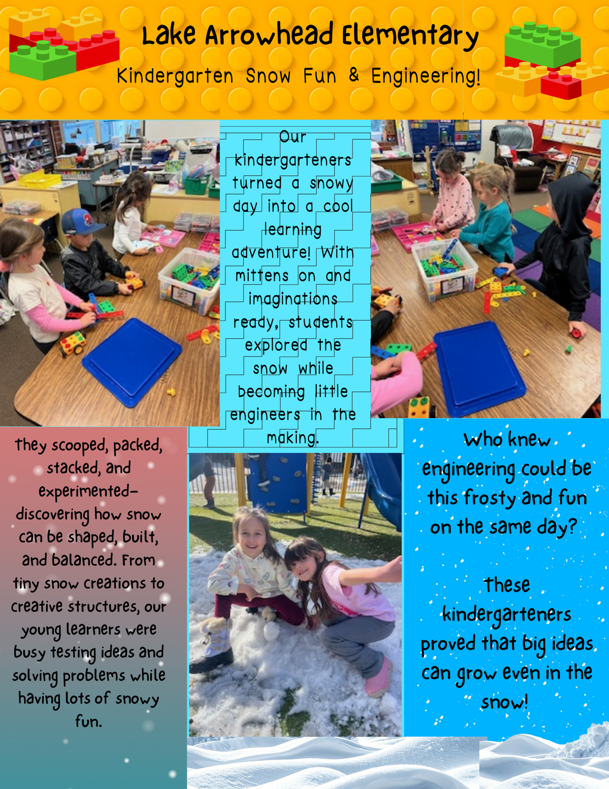 Page: Lake Arrowhead Elementary-Our kindergarteners turned a snowy day into a cool learning adventure! With mittens on and imaginations ready, students explored the snow while becoming little engineers in the making. They scooped, packed, stacked, and experimented—discovering how snow can be shaped, built, and balanced. From tiny snow creations to creative structures, our young learners were busy testing ideas and solving problems while having lots of snowy fun. Who knew engineering could be this frosty and fun on the same day? These kindergarteners proved that big ideas can grow even in the snow!