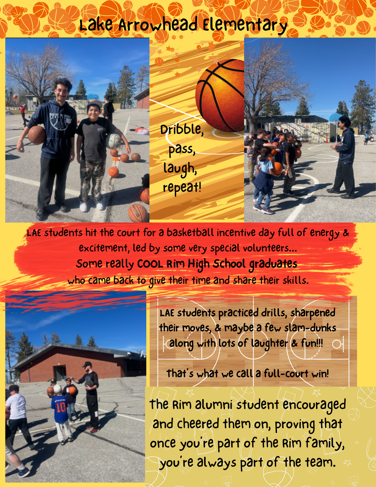 Page: Lake Arrowhead Elementary- Dribble, pass, laugh, repeat! LAE students hit the court for a basketball incentive day full of energy & excitement, led by some very special volunteers...Some really COOL Rim High School graduates who came back to give their time and share their skills. LAE students practiced drills, sharpened their moves, & maybe a few slam-dunks along with lots of laughter & fun!!! That’s what we call a full-court win! The Rim alumni student encouraged and cheered them on, proving that once you’re part of the Rim family, you’re always part of the team.