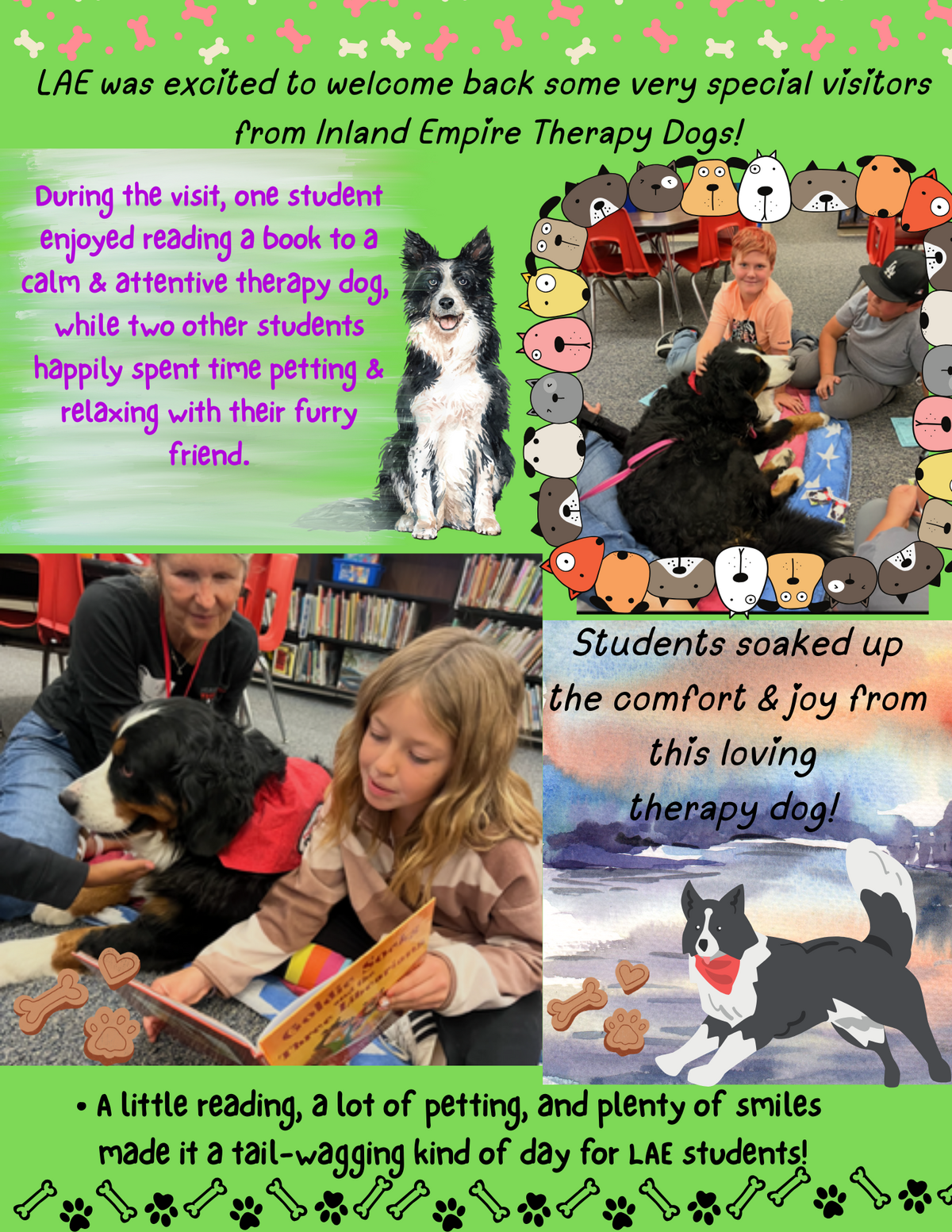 Page: LAE was excited to welcome back some very special visitors from Inland Empire Therapy Dogs! During the visit, one student enjoyed reading a book to a calm & attentive therapy dog, while two other students happily spent time petting & relaxing with their furry friend. Students soaked up the comfort & joy from this loving