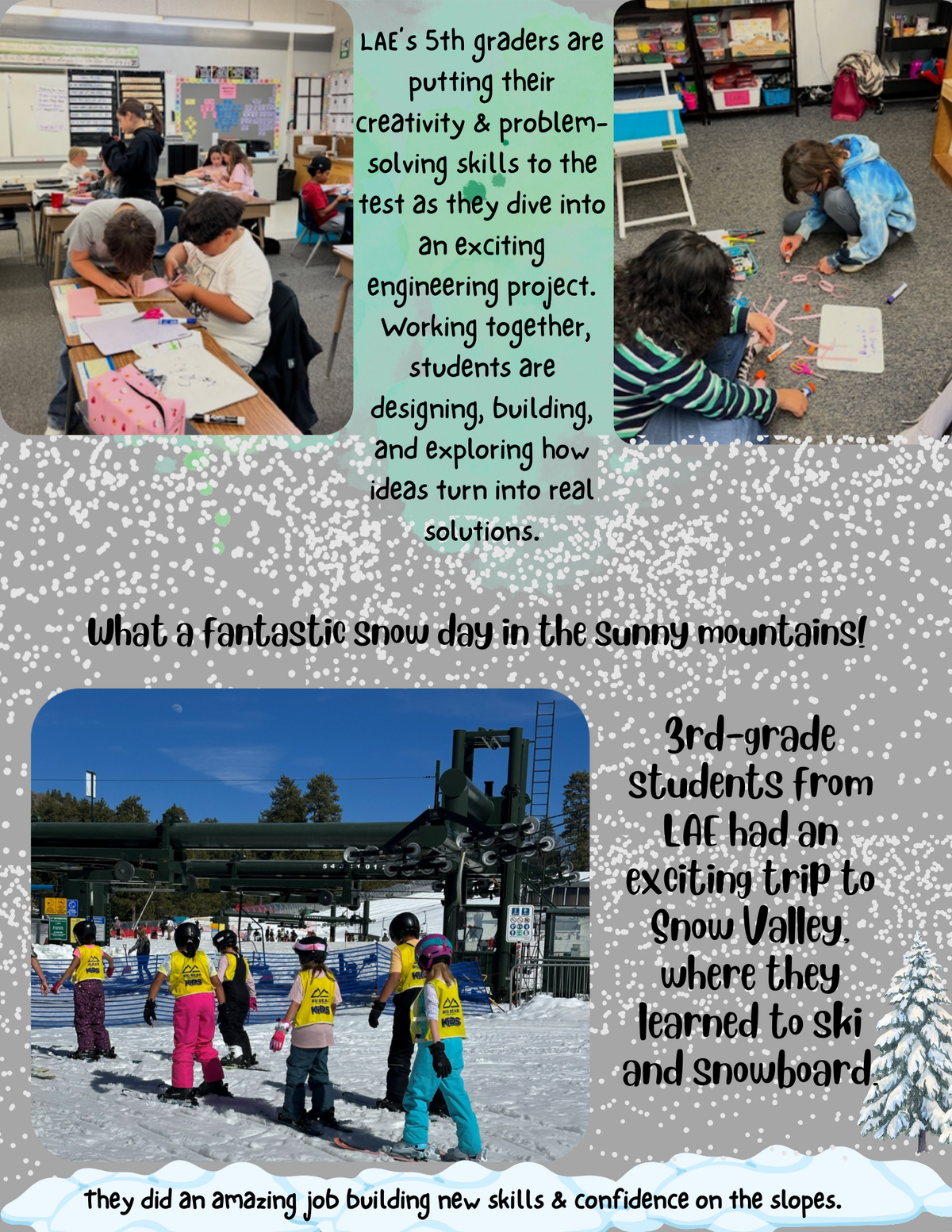 Working together, students are designing, building, and exploring how ideas turn into real solutions. What a fantastic snow day in the sunny mountains! 3rd-grade students from LAE had an exciting trip to Snow Valley, where they learned to ski and snowboard. They did an amazing job building new skills & confidence on the slopes.