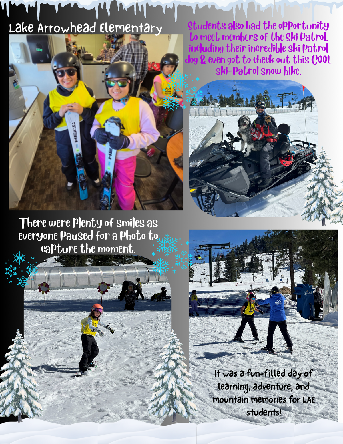 Page: Lake Arrowhead Elementary- Students also had the opportunity to meet members of the Ski Patrol, including their incredible ski patrol dog & even got to check out this COOL ski-patrol snow bike. There were plenty of smiles as everyone paused for a photo to capture the moment. It was a fun-filled day of learning, adventure, and mountain memories for LAE students!