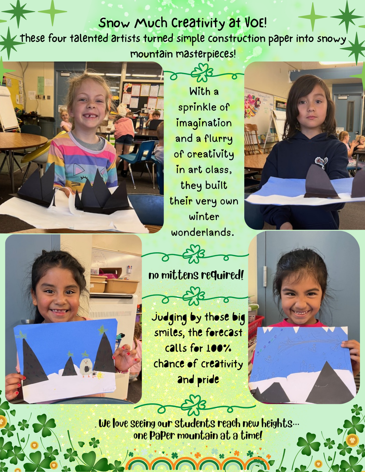 Page: Snow Much Creativity at VOE!- These four talented artists turned simple construction paper into snowy mountain masterpieces! With a sprinkle of imagination and a flurry of creativity in art class, they built their very own winter wonderlands. no mittens required! Judging by those big smiles, the forecast calls for a 100% chance of creativity and pride. We love seeing our students reach new heights… one paper mountain at a time!
