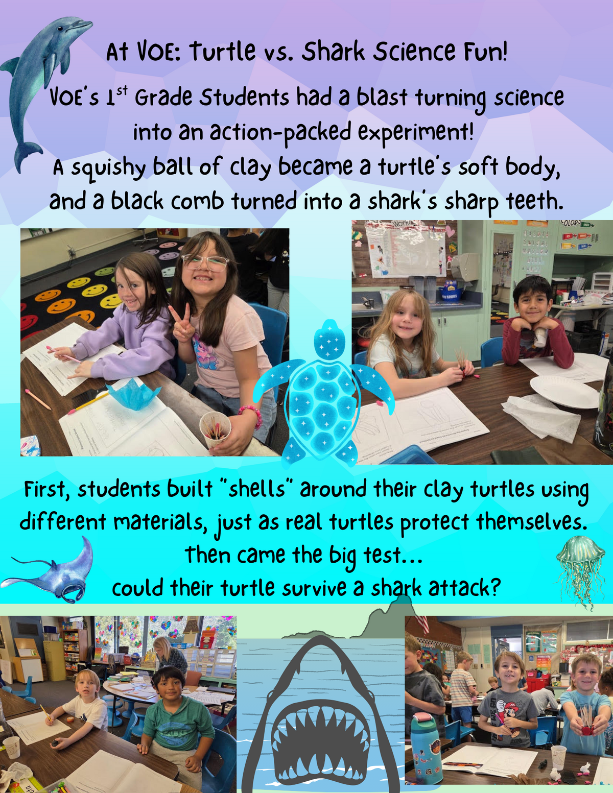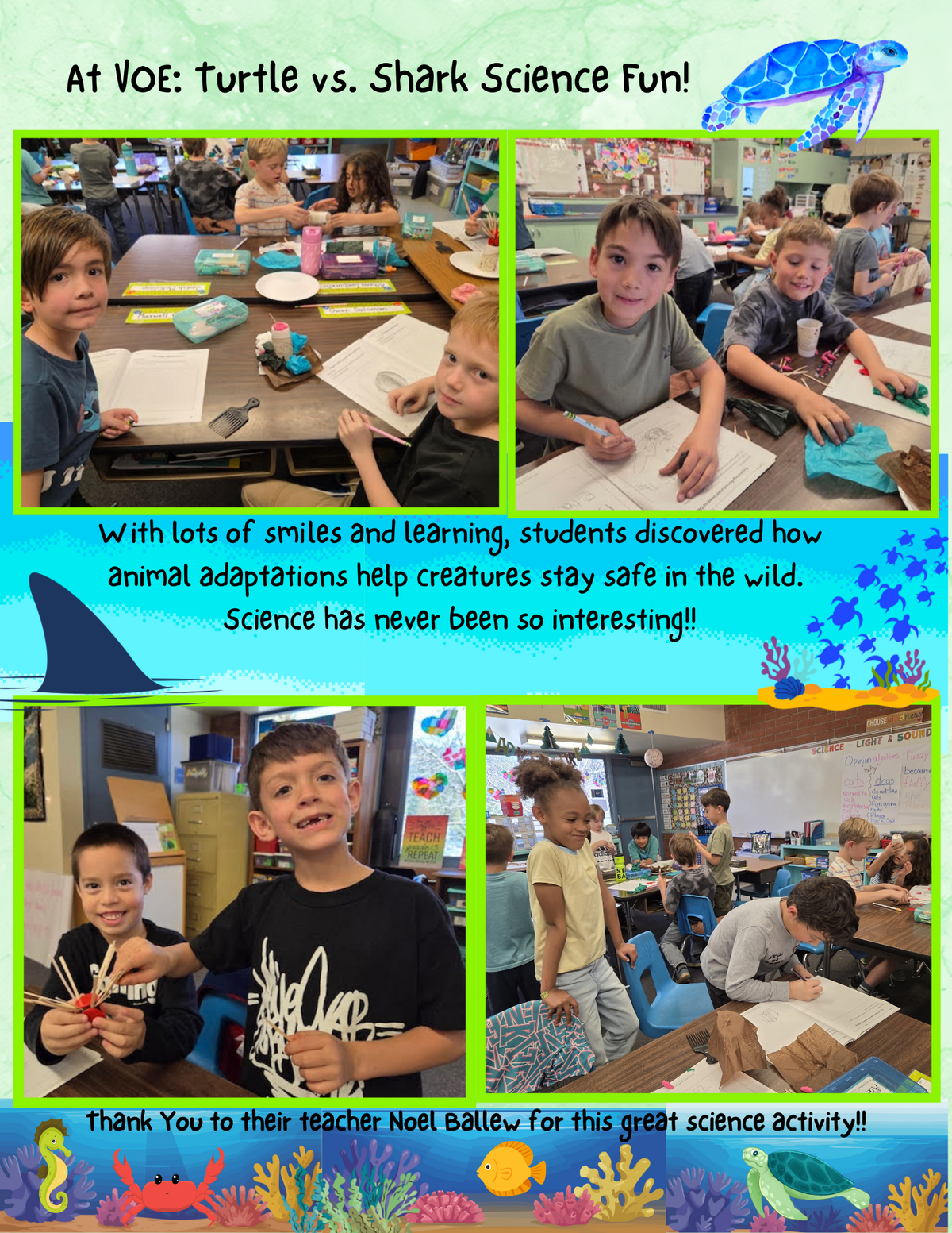 Page: At VOE: Turtle vs. Shark Science Fun! With lots of smiles and learning, students discovered how animal adaptations help creatures stay safe in the wild.