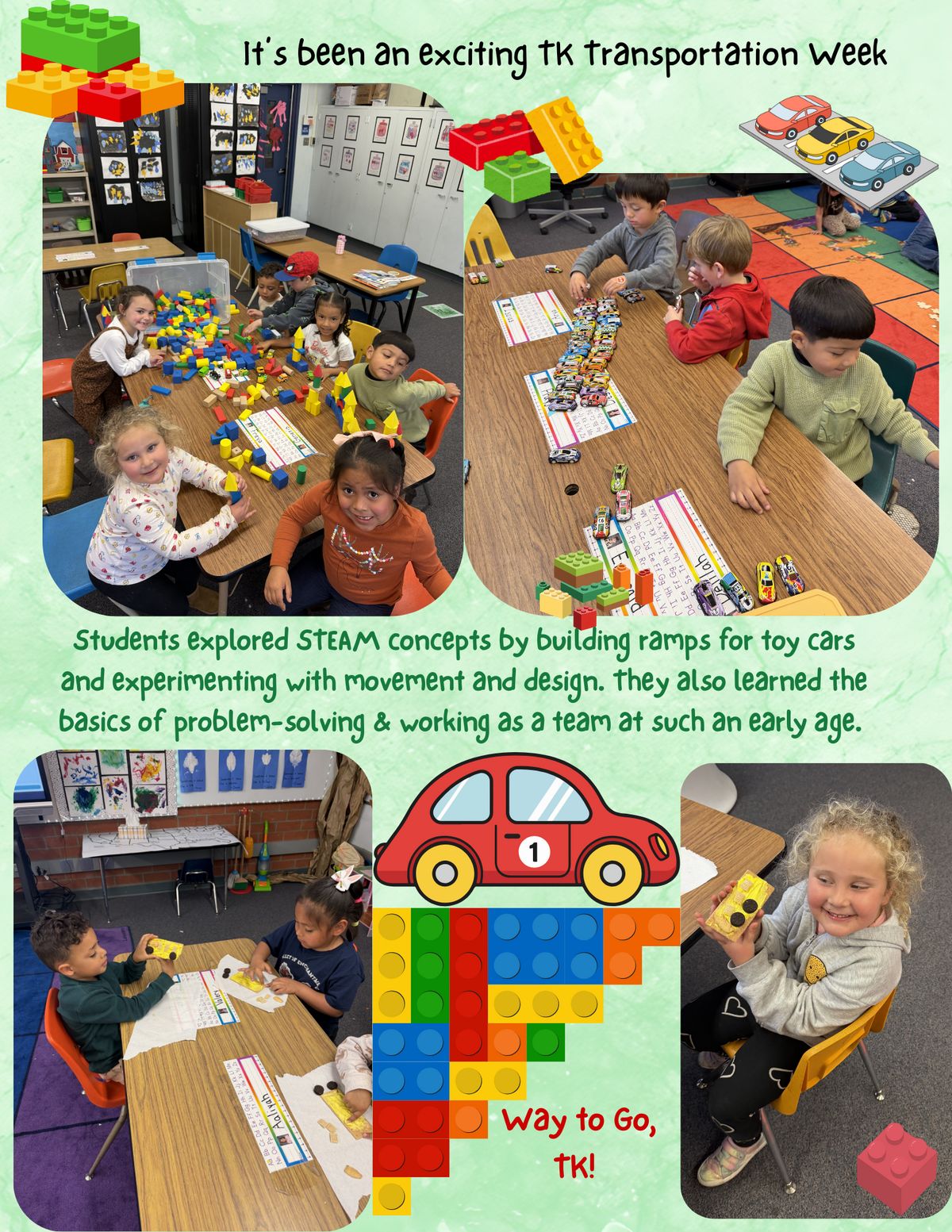 Page: It’s been an exciting TK Transportation Week. Students explored STEAM concepts by building ramps for toy cars and experimenting with movement and design. They also learned the basics of problem-solving & working as a team at such an early age. Way to Go, TK!