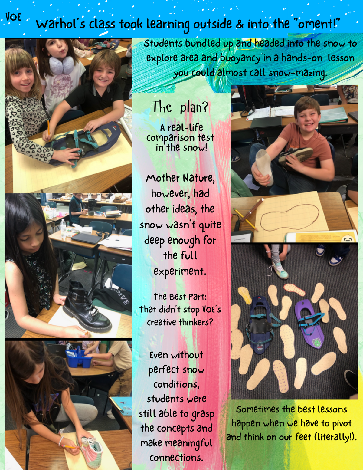 Page: VOE-Warhol’s class took learning outside & into the “oment!” Students bundled up and headed into the snow to explore area and buoyancy in a hands-on lesson you could almost call snow-mazing. The plan? A real-life comparison test in the snow! Mother Nature, however, had other ideas; the snow wasn’t quite deep enough for the full experiment. The Best Part: That didn’t stop VOE’s creative thinkers? Even without perfect snow conditions, students still grasped the concepts and made meaningful connections. Sometimes the best lessons happen when we have to pivot and think on our feet (literally!).