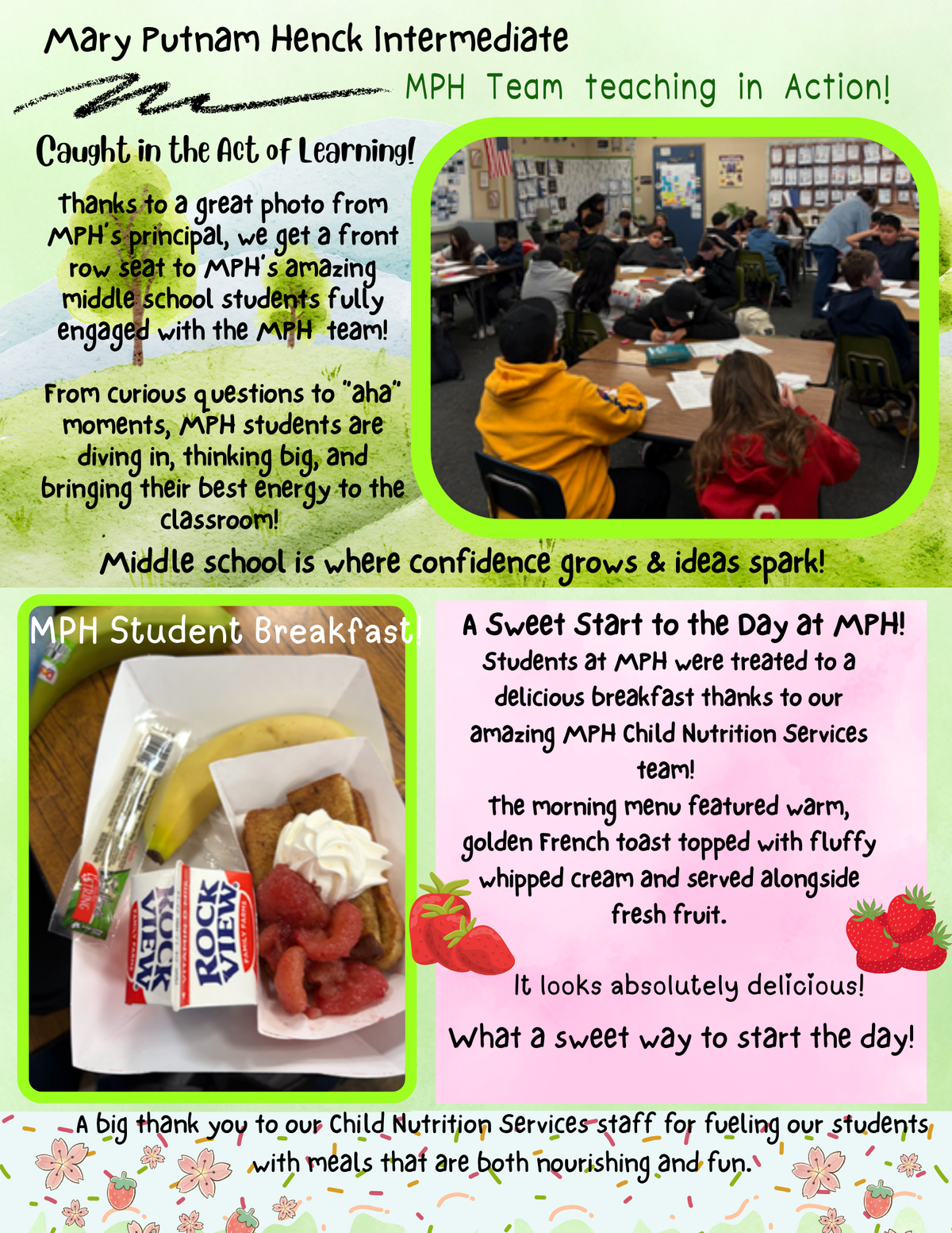Page: Mary Putnam Henck Intermediate-MPH Team teaching in Action! Thanks to a great photo from MPH’s principal, we get a front row seat to MPH’s amazing middle school students fully engaged with the MPH team! From curious questions to “aha” moments, MPH students are diving in, thinking big, and bringing their best energy to the classroom! Middle school is where confidence grows & ideas spark! MPH Student Breakfast! A Sweet Start to the Day at MPH! Students at MPH were treated to a delicious breakfast thanks to our amazing MPH Child Nutrition Services team! The morning menu featured warm, golden French toast topped with fluffy whipped cream and served alongside fresh fruit. It looks absolutely delicious! What a sweet way to start the day! A big thank you to our Child Nutrition Services staff for fueling our students with meals that are both nourishing and fun.