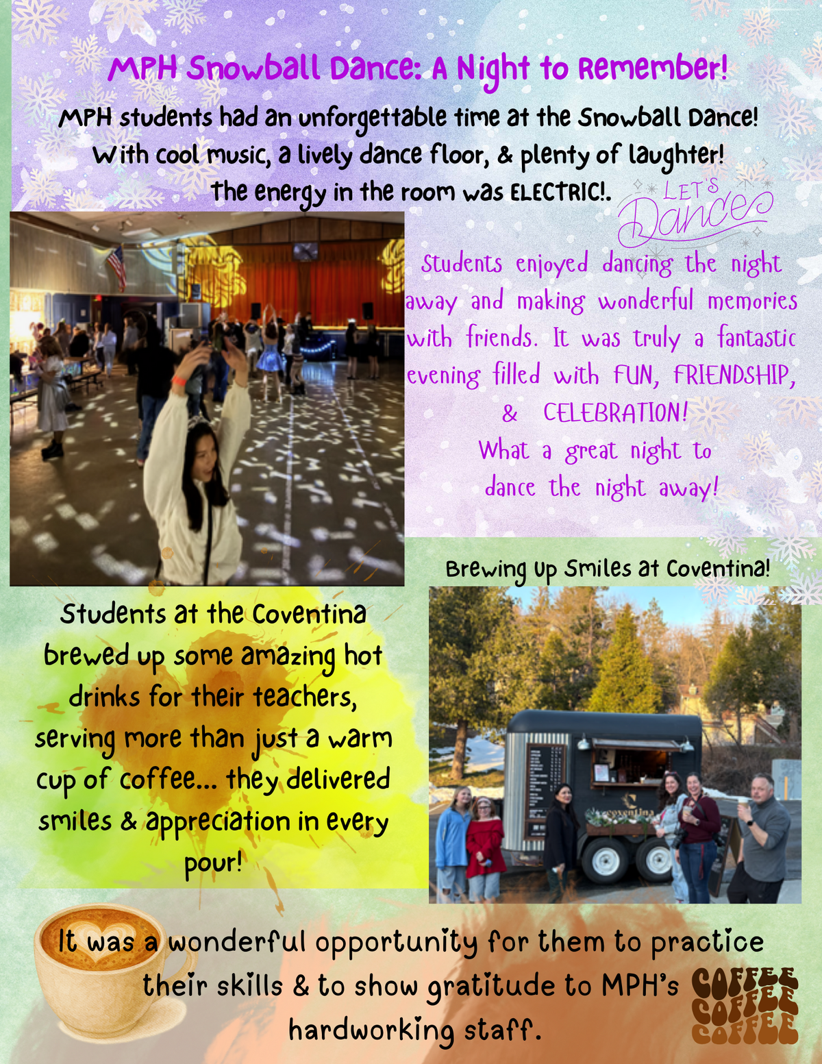 Page: MPH Snowball Dance: A Night to Remember! MPH students had an unforgettable time at the Snowball Dance! With cool music, a lively dance floor, & plenty of laughter! The energy in the room was ELECTRIC!. Students enjoyed dancing the night away and making wonderful memories with friends. It was truly a fantastic evening filled with FUN, FRIENDSHIP, & CELEBRATION! What a great night to dance the night away! Students at the Coventina brewed up some amazing hot drinks for their teachers, serving more than just a warm cup of coffee... they delivered smiles & appreciation in every pour! It was a wonderful opportunity for them to practice their skills & to show gratitude to MPH’s hardworking staff.