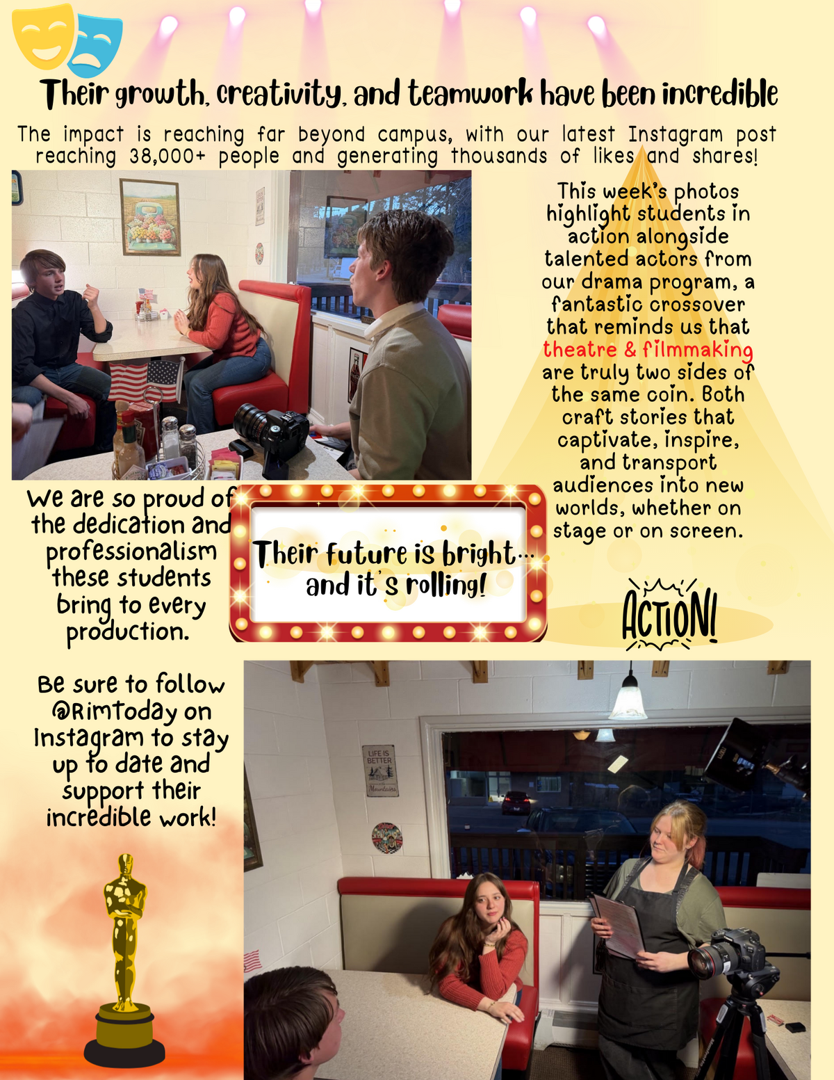 Page: Their growth, creativity, and teamwork have been incredible. The impact is reaching far beyond campus, with our latest Instagram post reaching 38,000+ people and generating thousands of likes and shares!. This week’s photos highlight students in action alongside talented actors from our drama program, a fantastic crossover that reminds us that theatre & filmmaking are truly two sides of the same coin. Both craft stories that captivate, inspire, and transport audiences into new worlds, whether on stage or on screen. We are so proud of the dedication and professionalism these students bring to every production.