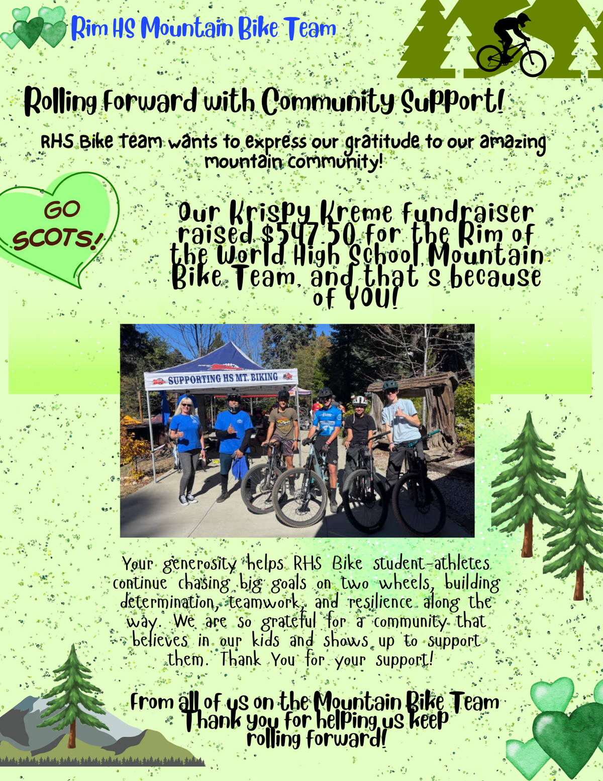 Page: Rim HS Mountain Bike Team-Rolling Forward with Community Support! RHS Bike Team wants to express our gratitude to our amazing mountain community! "Our Krispy Kreme fundraiser raised $547.50 for the Rim of the World High School Mountain Bike Team, and that’s because of YOU!" Your generosity helps RHS Bike student-athletes continue chasing big goals on two wheels, building determination, teamwork, and resilience along the way. We are so grateful for a community that believes in our kids and shows up to support them. Thank you for your support! From all of us on the Mountain Bike Team Thank you for helping us keep