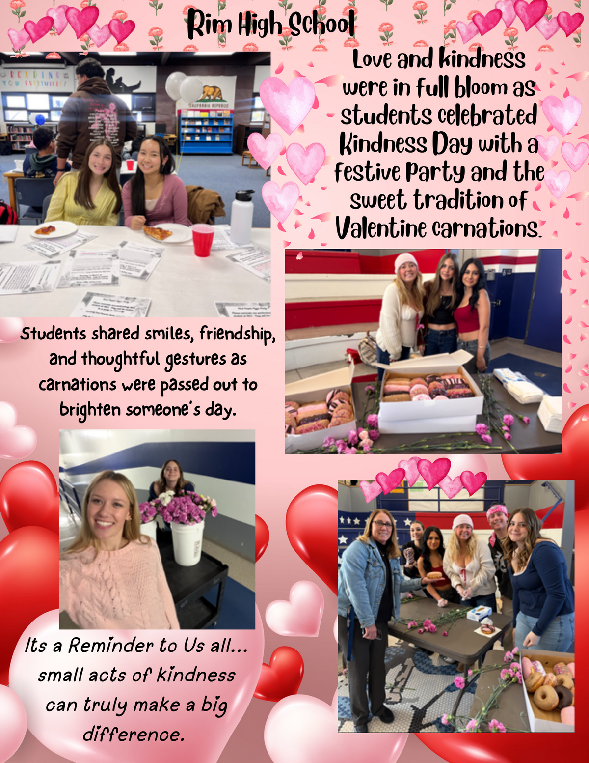 Page: Rim High School-Love and kindness were in full bloom as students celebrated Kindness Day with a festive party and the sweet tradition of Valentine carnations. Students shared smiles, friendship, and thoughtful gestures as carnations were passed out to brighten someone’s day. Its a Reminder to Us all... small acts of kindness can truly make a big difference.