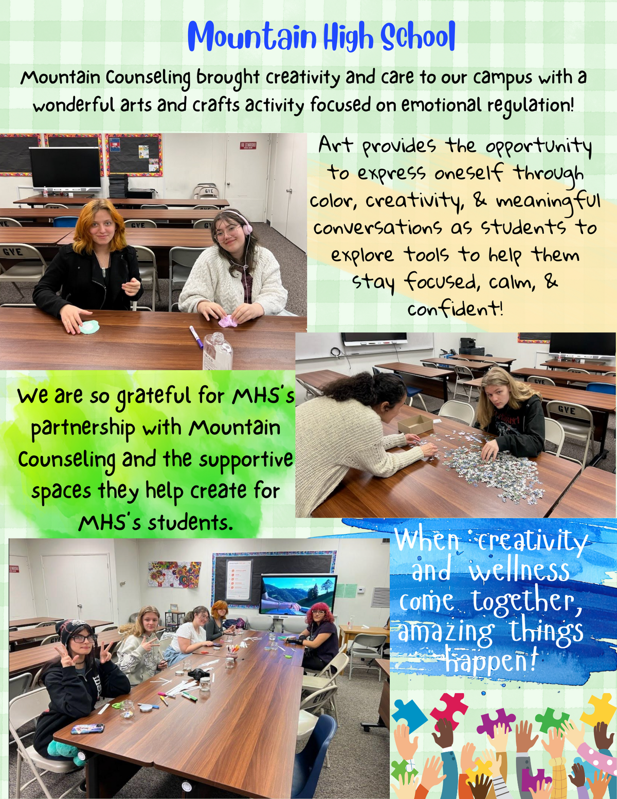 Page: Mountain High School-Mountain Counseling brought creativity and care to our campus with a wonderful arts and crafts activity focused on emotional regulation!