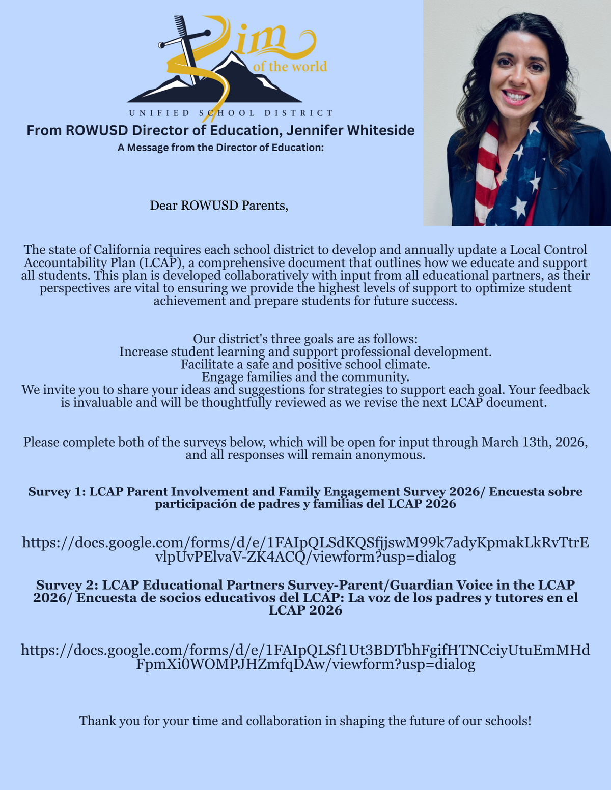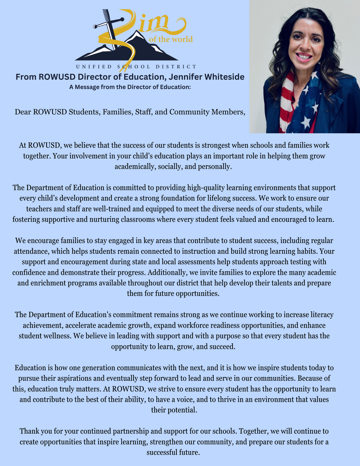 Page: From ROWUSD Director of Education, Jennifer Whiteside A Message from the Director of Education: Dear ROWUSD Students, Families, Staff, and Community Members, At ROWUSD, we believe that the success of our students is strongest when schools and families work together. Your involvement in your child’s education plays an important role in helping them grow academically, socially, and personally.