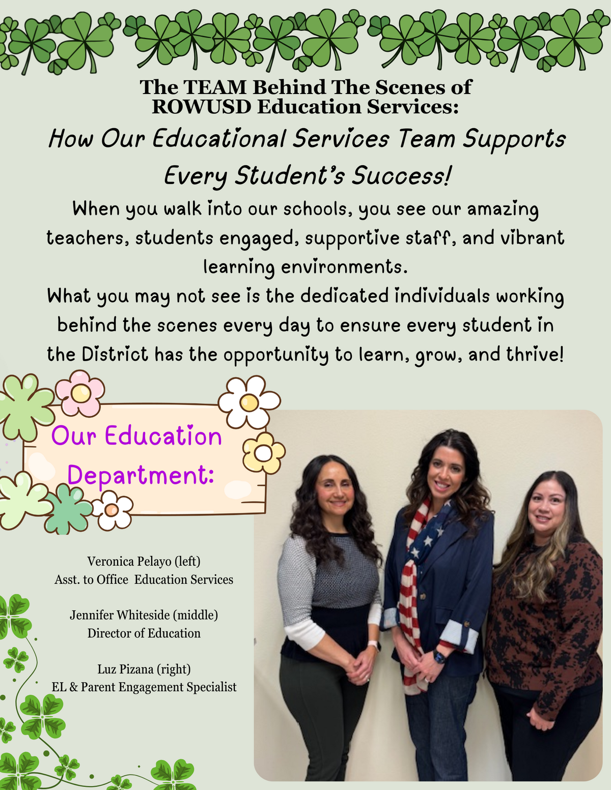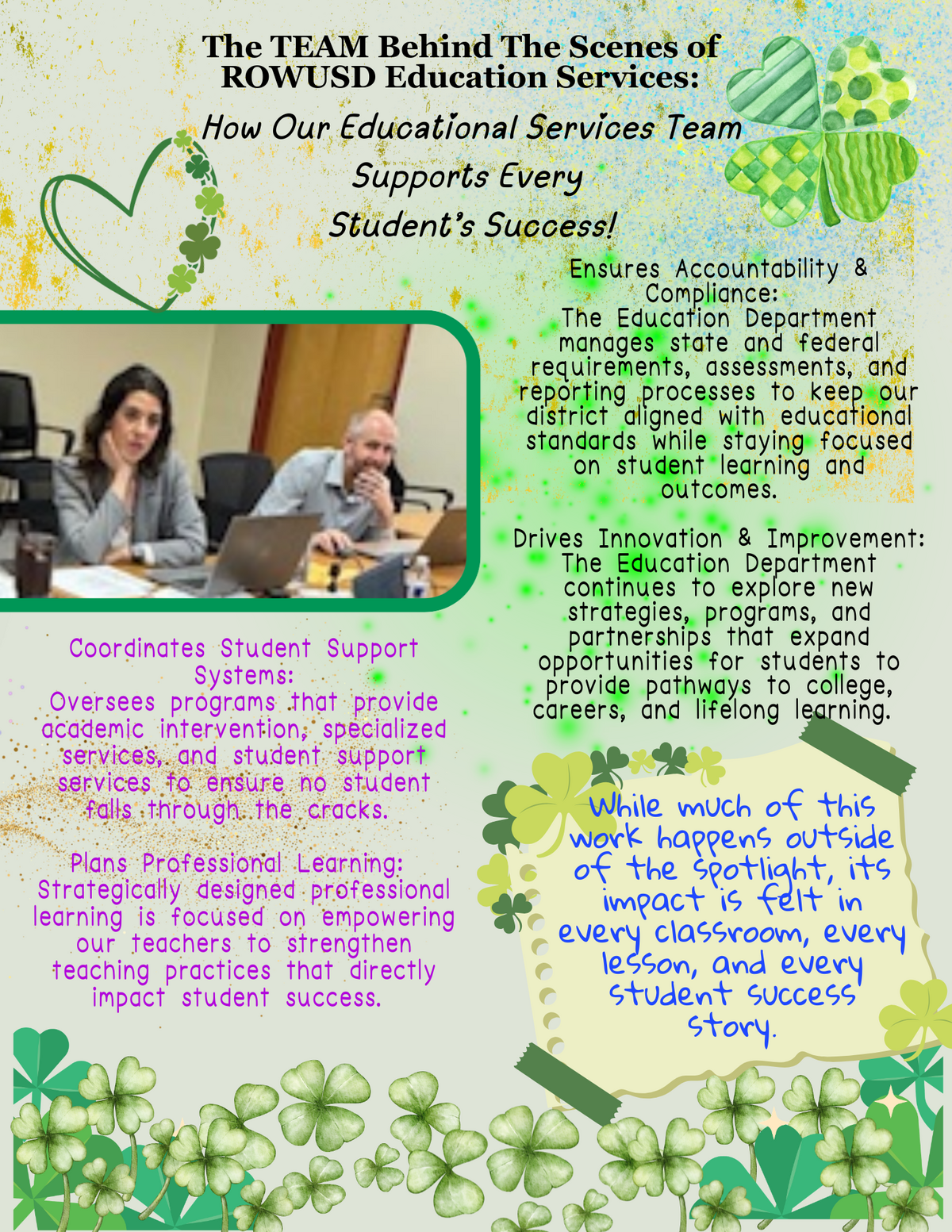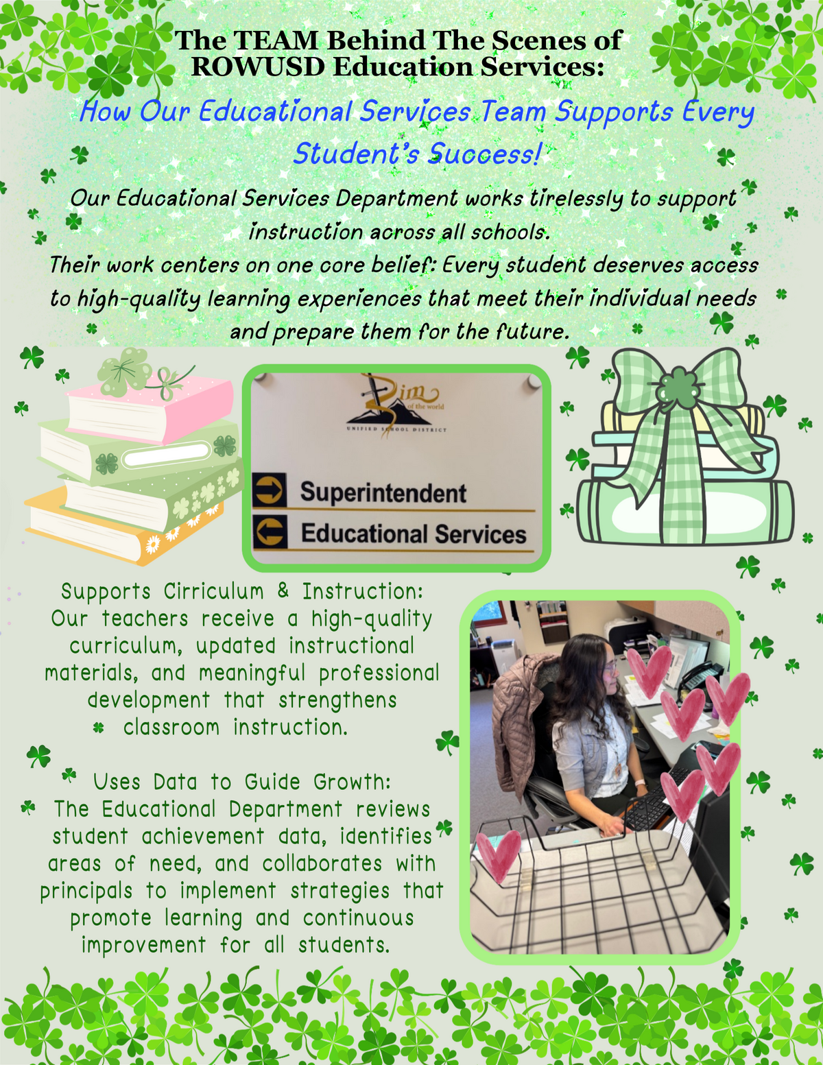 Page: The TEAM Behind The Scenes of ROWUSD Education Services: How Our Educational Services Team Supports Every Student’s Success! When you walk into our schools, you see our amazing teachers, students engaged, supportive staff, and vibrant learning environments. What you may not see is the dedicated individuals working behind the scenes every day to ensure every student in the District has the opportunity to learn, grow, and thrive! Our Education