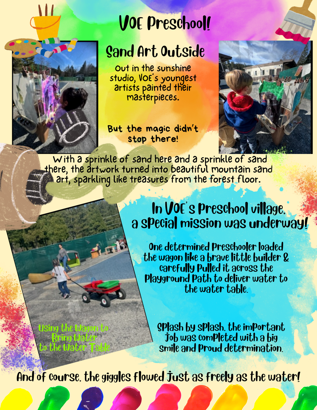 Page: VOE Preschool! Sand Art Outside. Out in the sunshine studio, VOE’s youngest artists painted their masterpieces. But the magic didn’t stop there! With a sprinkle of sand here and a sprinkle of sand there, the artwork turned into beautiful mountain sand art, sparkling like treasures from the forest floor.
