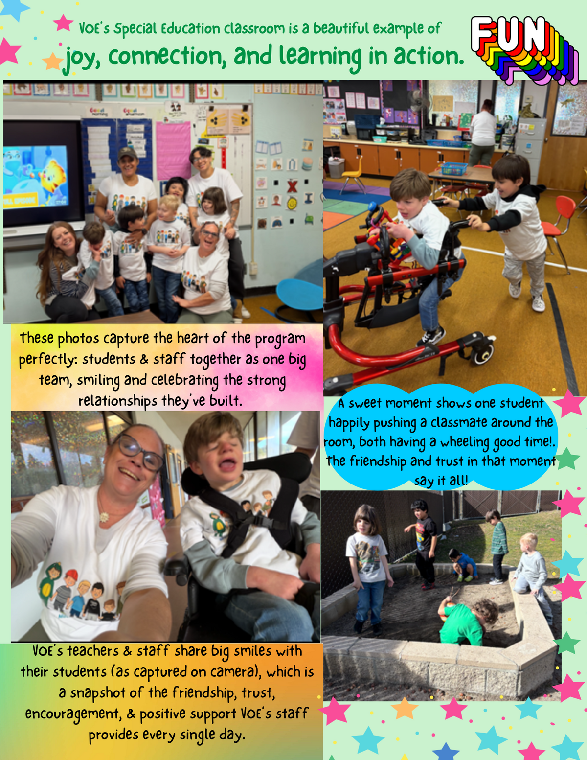 Page: VOE’s Special Education classroom is a beautiful example of joy, connection, and learning in action. These photos capture the heart of the program perfectly: students & staff together as one big team, smiling and celebrating the strong relationships they’ve built. A sweet moment shows one student happily pushing a classmate around the room, both having a wheeling good time!. The friendship and trust in that moment say it all! VOE’s teachers & staff share big smiles with their students (as captured on camera), which is a snapshot of the friendship, trust, encouragement, & positive support VOE’s staff provides every single day.