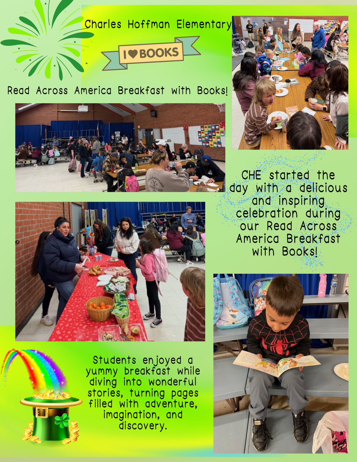 Page: Charles Hoffman Elementary-Read Across America Breakfast with Books! CHE started the day with a delicious and inspiring celebration during our Read Across America Breakfast with Books! Students enjoyed a yummy breakfast while diving into wonderful stories, turning pages filled with adventure, imagination, and discovery.