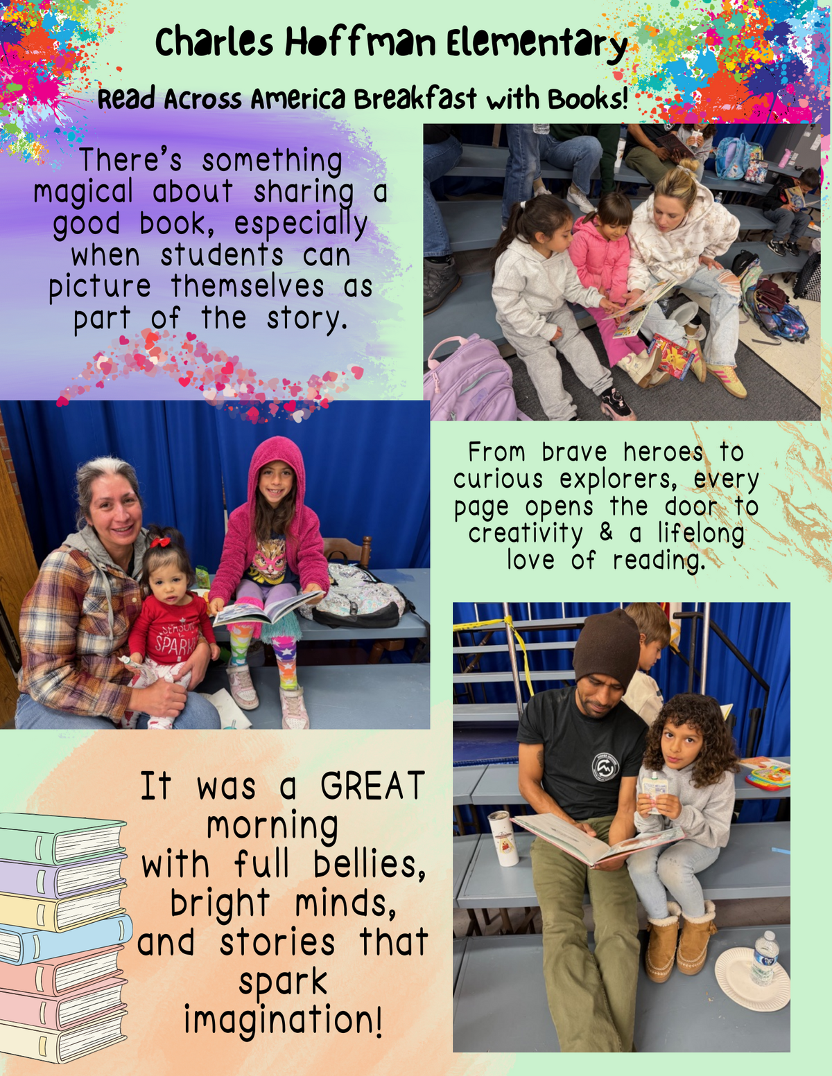 Page: Charles Hoffman Elementary-Read Across America Breakfast with Books! There’s something magical about sharing a good book, especially when students can picture themselves as part of the story. From brave heroes to curious explorers, every page opens the door to creativity & a lifelong love of reading. It was a GREAT morning with full bellies, bright minds, and stories that spark imagination!