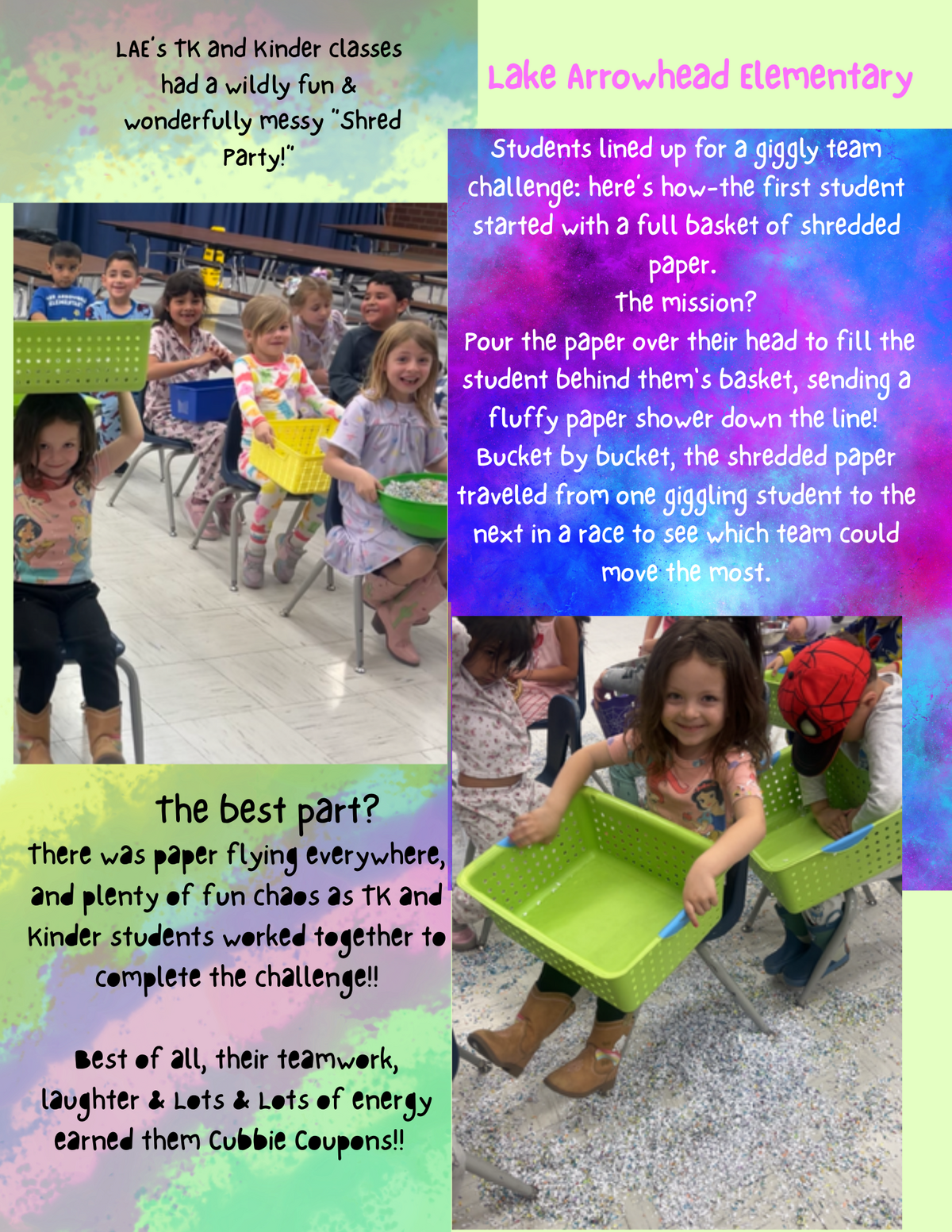 Page: Lake Arrowhead Elementary-LAE’s TK and Kinder classes had a wildly fun & wonderfully messy “Shred Party!” Students lined up for a giggly team challenge: here’s how-the first student started with a full basket of shredded paper. The mission? Pour the paper over their head to fill the student behind them's basket, sending a fluffy paper shower down the line! Bucket by bucket, the shredded paper traveled from one giggling student to the next in a race to see which team could move the most. The best part? There was paper flying everywhere, and plenty of fun chaos as TK and Kinder students worked together to complete the challenge!! Best of all, their teamwork, laughter, & Lots & Lots of energy earned them Cubbie Coupons!!