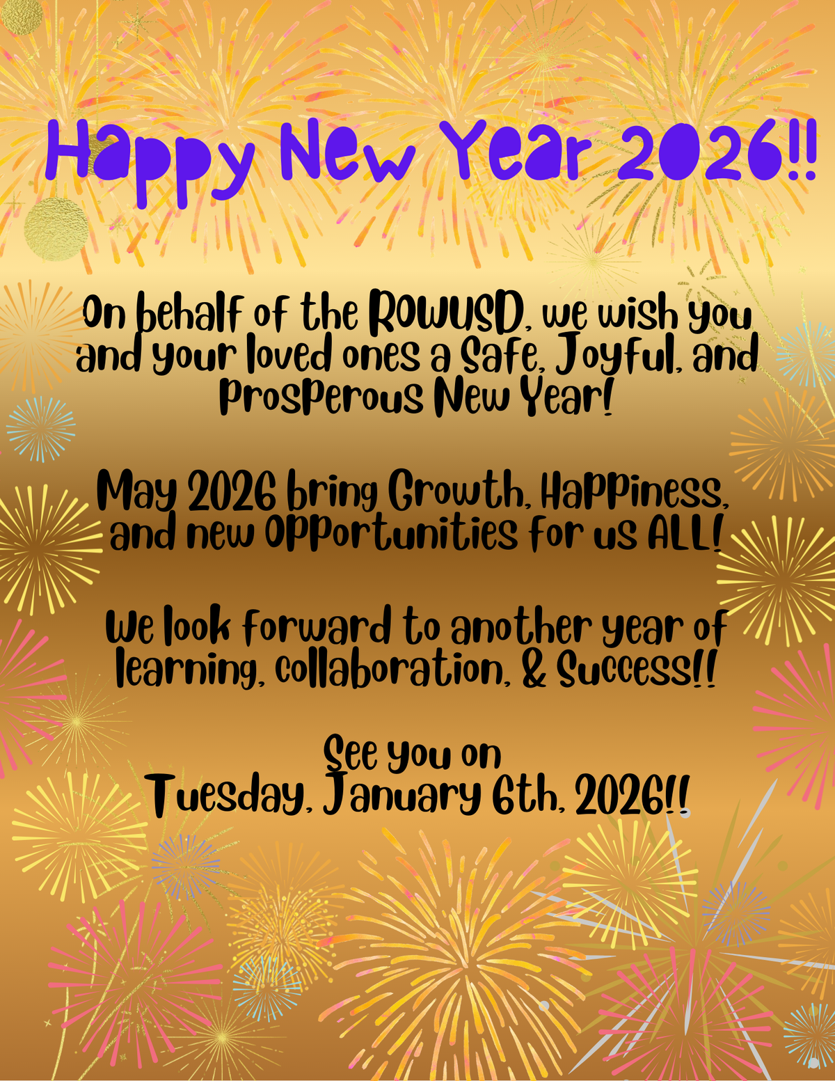 Dear ROWUSD Families and StaffOn behalf of ROWUSD, we send our warmest wishes to you and your loved ones for a Safe, Joyful, and Prosperous New Year! May 2026 shine with growth, happiness, and exc...