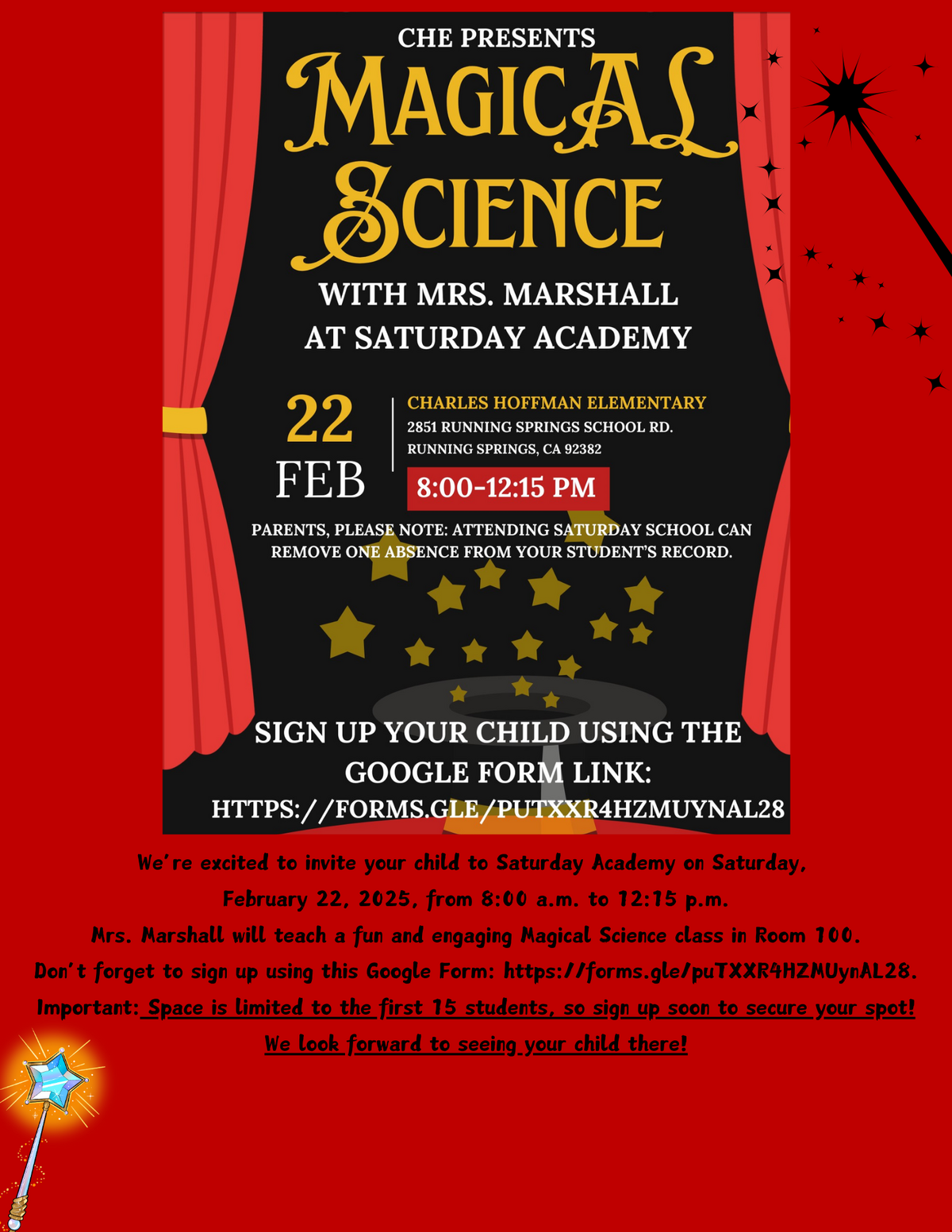 Page Four: CHE Presents Magic As Science with Mrs. Marshall at Saturday Academy. Location for CHE Saturday Academy at 2851 Running Springs School Rd. Running Springs from 8 am to 12:15 pm on February 22nd, 2025.  Parent Note: Attending Saturday School can remove one absence from your student's record. Sign up your child using the Google Form Link. We’re excited to invite your child to Saturday Academy on Saturday, February 22, 2025, from 8:00 a.m. to 12:15 p.m. Mrs. Marshall will teach a fun and engaging Magical Science class in Room 100. Don’t forget to sign up using this Google Form: https://forms.gle/puTXXR4HZMUynAL28. Important: Space is limited to the first 15 students, so sign up soon to secure your spot! We look forward to seeing your child there!