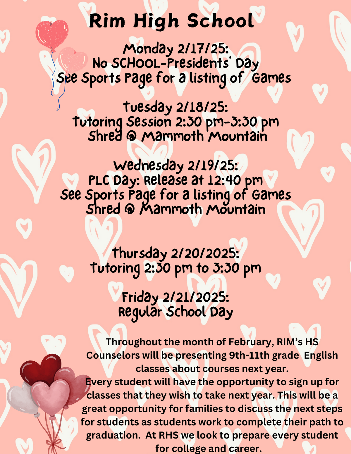 Page Thirteen: Rim High School: Monday 2/17/25: No SCHOOL-Presidents’ Day See Sports Page for a listing of  Games  Tuesday 2/18/25: Tutoring Session 2:30 pm-3:30 pm Shred @ Mammoth Mountain Wednesday 2/19/25: PLC Day: Release at 12:40 pm See Sports Page for a listing of Games Shred @ Mammoth Mountain Thursday 2/20/2025: Tutoring 2:30 pm to 3:30 pm Friday 2/21/2025: Regular School Day.; Throughout the month of February, RIM’s HS Counselors will be presenting 9th-11th grade  English classes about courses next year. Every student will have the opportunity to sign up for classes that they wish to take next year. This will be a great opportunity for families to discuss the next steps for students as students work to complete their path to graduation.  At RHS we look to prepare every student for college and career.