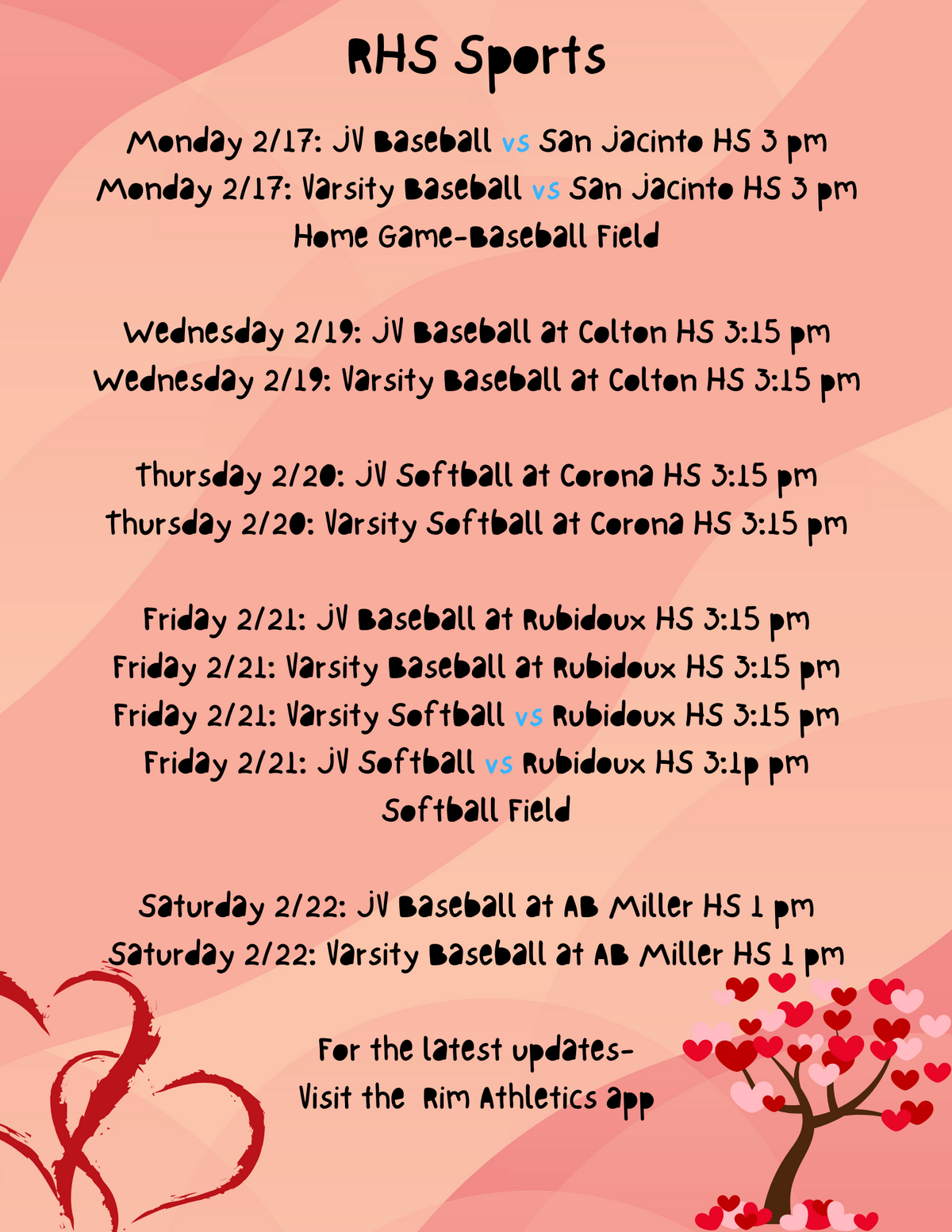 Page Fourteen: RHS Sports; Monday 2/17: JV Baseball vs San Jacinto HS 3 pm Monday 2/17: Varsity Baseball vs San Jacinto HS 3 pm Home Game-Baseball Field Wednesday 2/19: JV Baseball at Colton HS 3:15 pm Wednesday 2/19: Varsity Baseball at Colton HS 3:15 pm Thursday 2/20: JV Softball at Corona HS 3:15 pm Thursday 2/20: Varsity Softball at Corona HS 3:15 pm Friday 2/21: JV Baseball at Rubidoux HS 3:15 pm Friday 2/21: Varsity Baseball at Rubidoux HS 3:15 pm Friday 2/21: Varsity Softball vs Rubidoux HS 3:15 pm Friday 2/21: JV Softball vs Rubidoux HS 3:1p pm Softball Field Saturday 2/22: JV Baseball at AB Miller HS 1 pm Saturday 2/22: Varsity Baseball at AB Miller HS 1 pm For the latest updates- Visit the  Rim Athletics app