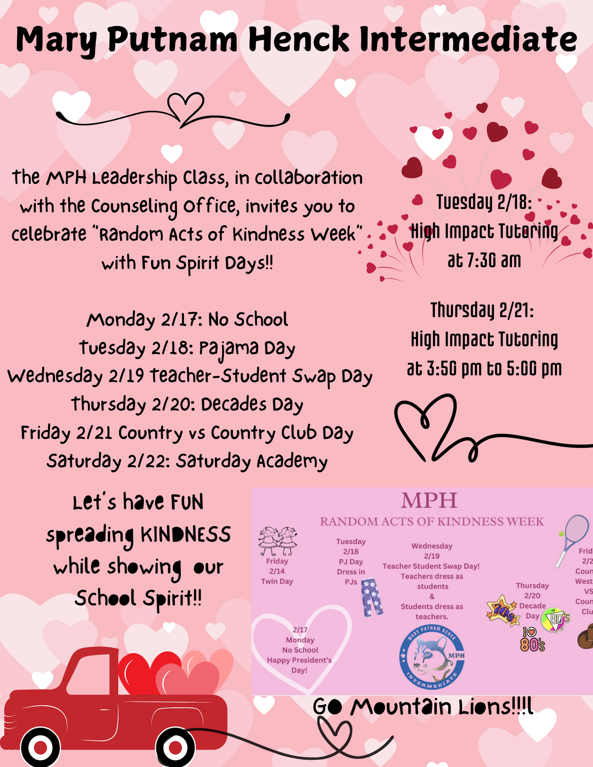 Page Eleven:  MPH  Mary Putnam Henck Intermediate; The MPH Leadership Class, in collaboration with the Counseling Office, invites you to celebrate “Random Acts of Kindness Week” with Fun Spirit Days!! Monday 2/17: No School Tuesday 2/18: Pajama Day Wednesday 2/19 Teacher-Student Swap Day Thursday 2/20: Decade Day Friday 2/21 Country vs Country Club Day; Tuesday 2/18: High Impact Tutoring at 7:30 am Thursday 2/21: High Impact Tutoring at 3:50 pm to 5:00 pm; Let’s have FUN spreading KINDNESS while showing  our School Spirit!! No School on Monday 2/27/25.