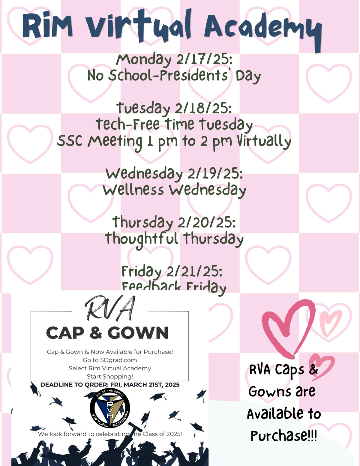 Page Fifteen: RIM Virtual Academy; Monday 2/17/25: Mindful Minute Monday Tuesday 2/18/25: Tech-Free Time Tuesday Wednesday 2/19/25: Wellness Wednesday Thursday 2/20/25: Thoughtful Thursday Friday 2/21/25: Feedback Friday. RVA Caps & Gowns are Available to Purchase!!! Deadline to Order: Friday, March 21st, 2025.